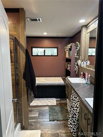 - Bathtub, Beamed Ceilings, Fireplace, Primary Suite, Separate Shower, Sliding Glass Doors, Split Bedrooms, Tub Shower, Walk In Closets, Window Treatments