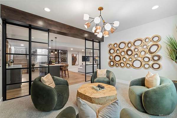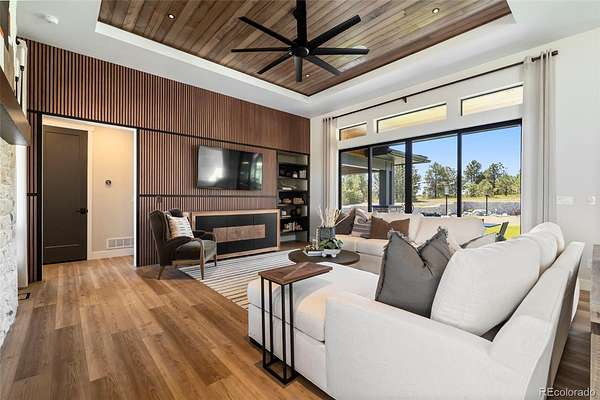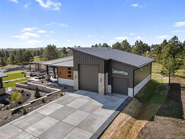 Enjoy this gorgeous brand new home in the Flying Horse North community. 6 bedroom, 4 full bath, 2 1/2 bath, 4 car garage home. Beautiful, thoughtful design throughout the home creates a one of kind home. The main level features lots of windows for a light, bright open space. The primary suite host a gorgeous bathroom and a private covered patio. Laundry room located just outside the primary suite. The kitchen includes a large island, contemporary cooktop hood, and butler's pantry. There are two other bedrooms with a shared bath, each with a separate vanity on the main level. The basement hosts 3 more bedrooms, including one with a private bath. The large rec room has a wet bar, fireplace and a stunning glassed wine storage room. When you visit look for the secret door which leads to a cozy speakeasy. The property also includes a 719 square foot one bed, one bath living space and a 1,313 square foot garage which can accommodate 4 cars or 2 cars and an RV. This home lends itself to enjoying the outdoors. There is an uncovered front patio with an indoor/outdoor fireplace. The rear of the home includes lots of covered patio spaces perfect for relaxing or entertaining. The large rear yard features low-maintenance turf, pergola with fire pit, hot tub, and a putting green. The casita also has its own partially covered patio overlooking the backyard.