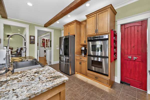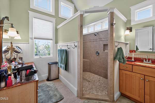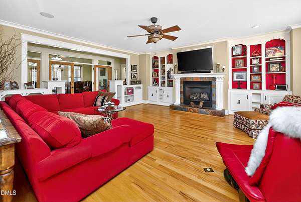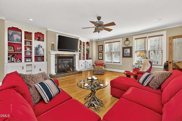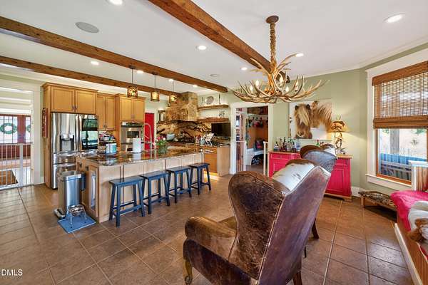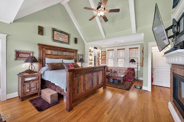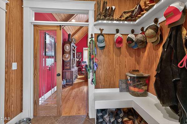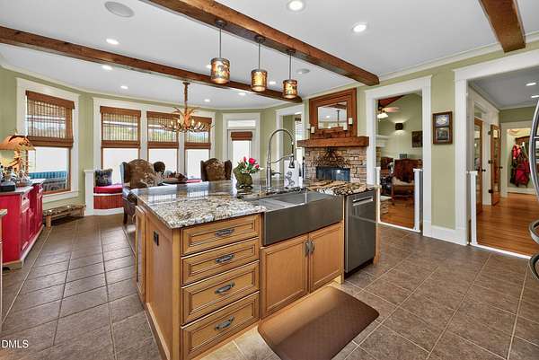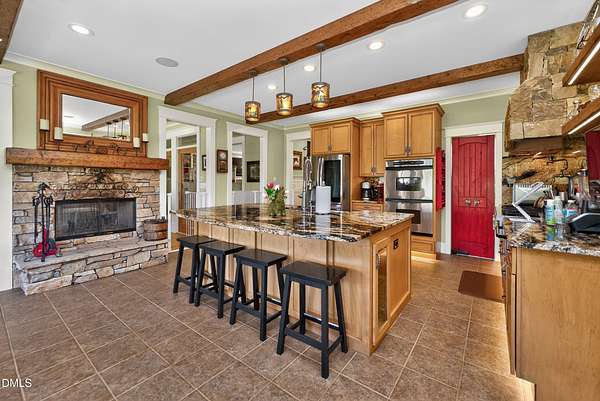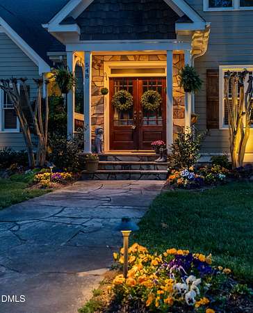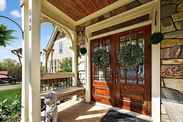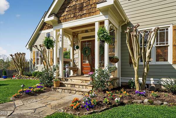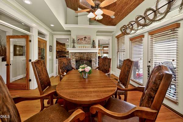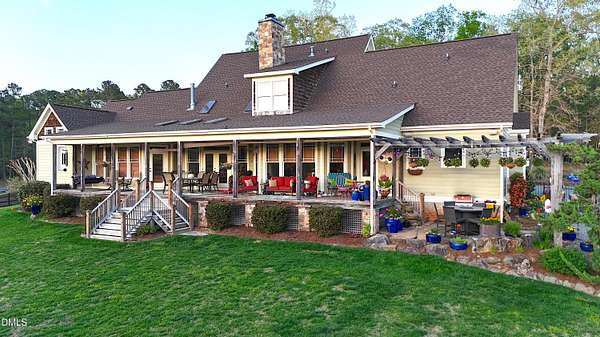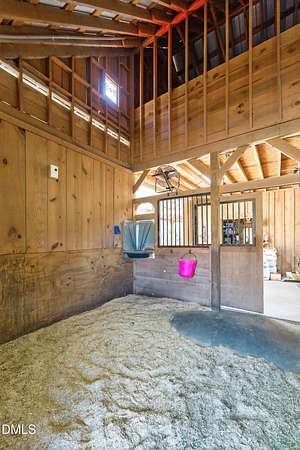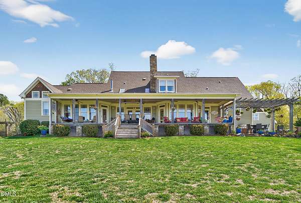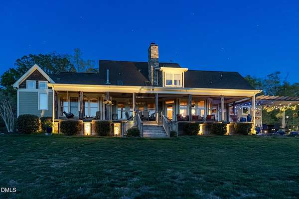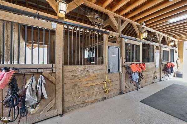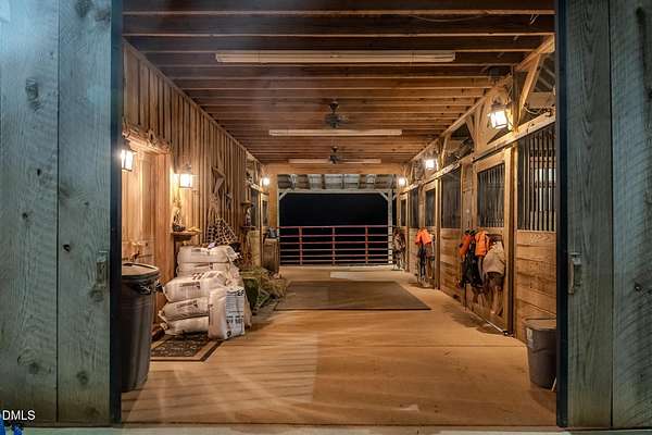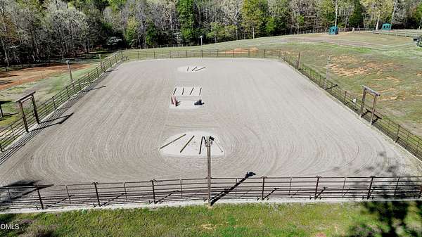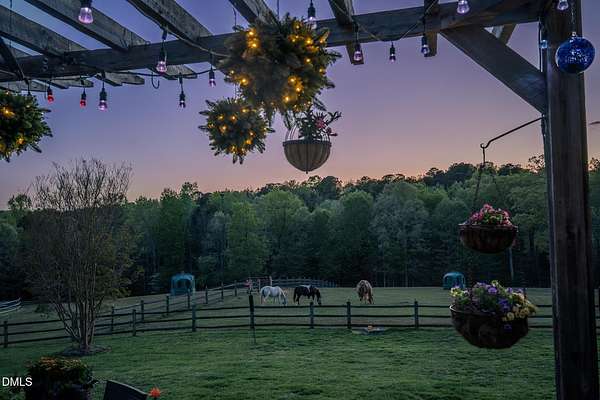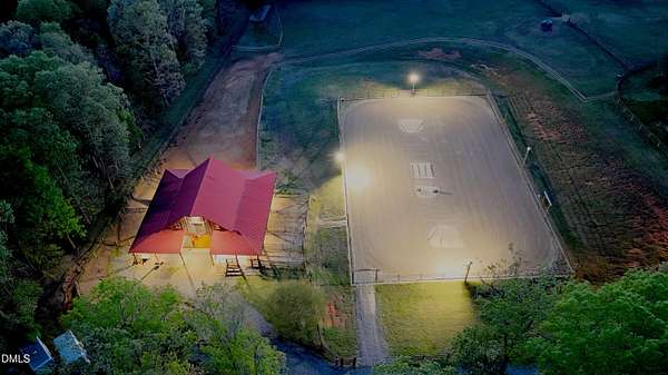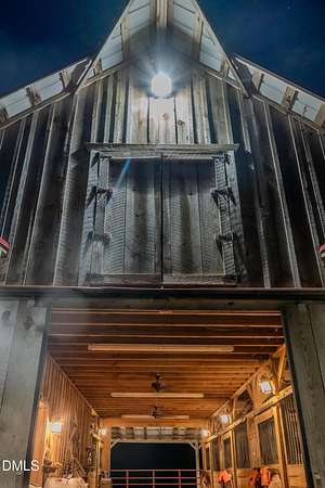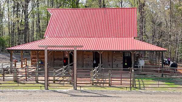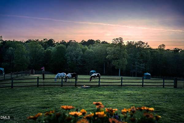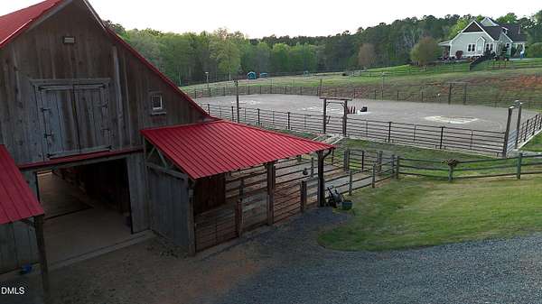 Escape to equestrian property heaven. This custom equestrian estate offers a rare blend of privacy, functionality, and elevated views just minutes from Lake Jordan. Positioned on a hilltop, the home overlooks rolling horse pastures framed by mature hardwoods, with sunsets that can be enjoyed from the expansive covered back porch spanning the width of the home. The custom-built residence features 3 bedrooms and 5 bathrooms across approximately 3,833 square feet, with extensive upgrades throughout including extensive custom millwork and detailed trim, hardwood flooring, and a great room with exposed beam cathedral ceilings. The kitchen is designed for both everyday living and entertaining, highlighted by high-end granite surfaces, custom cabinetry, and a two way fireplace. Equestrian amenities are thoughtfully designed and include a custom 6-stall barn with tack room, lofted hay storage, paddocks, lighted riding arena, and multiple pastures with 3 rail wood fence with no climb. The property is fully equipped for both personal use and training, with pasture views visible from multiple vantage points throughout the property. Possibility for additional acreage. Additional improvements include a detached 3-car garage with unfinished space above, already roughed in with electrical. Located just minutes from major commuting routes, and nearby amenities, with convenient access to Pittsboro, Apex, and RTP. This property combines rural setting with accessibility. Vista Point Boat Ramp and Jordan Lake Beach are just right down the road. Mason Point Horse Trail at Jordan Lake is 16 miles away.