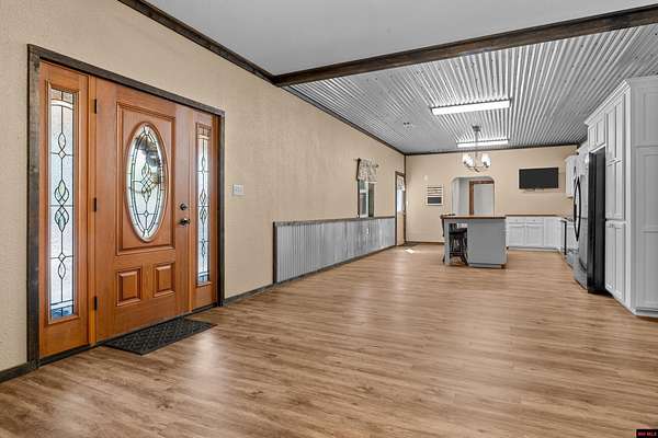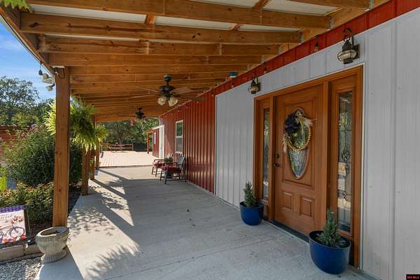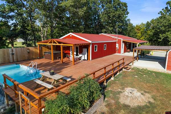 Dream barndominium, where rustic elegance meets modern living. Featuring 2 bedrooms, 2 baths with 1980 sqft, City water/septic. This home includes a luxurious walk-in closet, a spacious pantry, slow-close cabinets, and additional hidden storage. The open floor plan seamlessly connects the living, dining, and kitchen areas, making it perfect for entertaining. Step outside to enjoy covered porches and expansive decks, ideal for family and friends, along with a refreshing freshwater pool right in your backyard. The property includes a 20X18 insulated garage with electricity and concrete floors, plus an additional carport for extra parking. The home is wired for a whole house generator. Mostly fenced with a wet weather creek, the property is perfect for pets or livestock and features a garden area for the green thumb in your family. With a convenient 50 AMP RV hookup, this barndominium offers the perfect blend of comfort, style, and functionality, all while being restriction free!