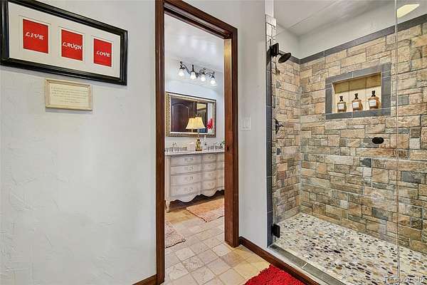 Private Owner’s Wing: Spacious main-level owner’s suite with coffered ceiling and stone fireplace, Spa-style bath with hammered copper soaking tub, dual vanities, walk-in rain shower with massage sprayers, and two walk-in closets