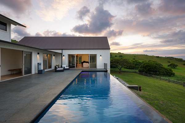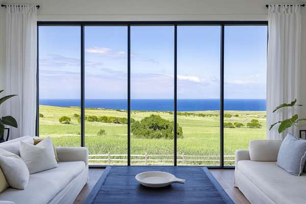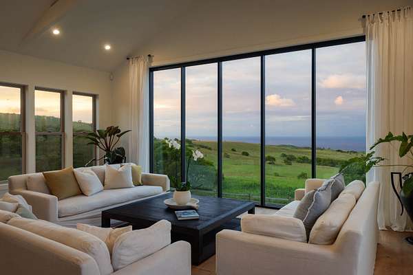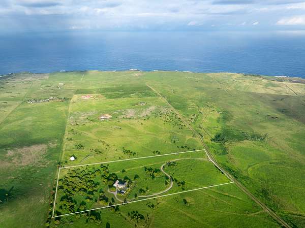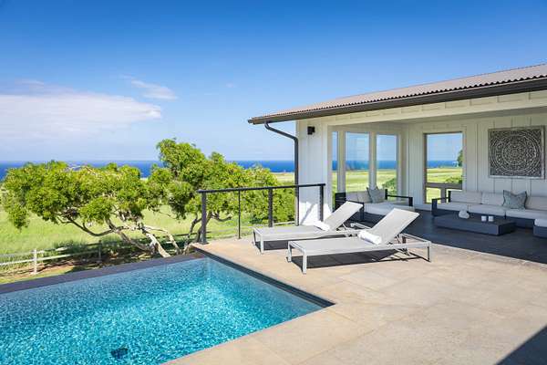 Set upon 20 private acres, this modern farmhouse enjoys sweeping 180 degree views of Maui and the Pacific, where migrating whales can be seen from the living spaces as they grace the horizon. The remodeled five bedroom, five and a half bath layout includes two private entry guest suites, each with its own wet bar and kitchenette. All bedrooms feature ensuite bathrooms with luxurious spa-like showers. A fully heated infinity pool overlooks the ocean, framed by expansive shaded areas for relaxed lounging and effortless entertaining. The great room features vaulted ceilings, expansive ocean facing windows, and a Carrara marble island. The chef's kitchen is equipped with Sub Zero and Wolf appliances. A full butler's pantry with a wine fridge, freezer, an additional dishwasher and ample storage supports larger gatherings. The upstairs primary suite captures panoramic views and includes a walk in closet and dedicated office nook. The property is fully fenced, with an additional wooden split rail perimeter fence surrounding the two acre home site. In December 2025, the home underwent a comprehensive refresh including a full exterior repaint, interior updates, all new pool equipment, outdoor lighting, a new irrigation system, a refinished garage floor, and a new water heater. The home is fully turnkey, with no details overlooked. Powered in part by a net metered solar system, the property also benefits from county water and high speed internet. All Restoration Hardware furnishings are included for a cohesive, ready to enjoy living experience. The land offers endless agricultural or ranching potential and is currently leased for grazing, resulting in lower property taxes. Within a quiet gated ranch of large acreage parcels, this true gem provides privacy, open space, and a highly functional layout for multi generational living or hosting. Minutes from town yet surrounded by uninterrupted ocean views, it is a rare offering in North Kohala.