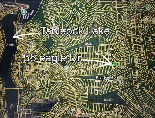 From the main entrance to Holiday Island off Hwy 23, head north on Holiday Island Dr. to the 4-way stop. Turn left onto Stateline Dr., then continue to Eagle Dr. Turn onto Eagle Dr.; the property will be on the left, second to last lot before Wild Turkey Dr. Look for a Collier & Associates sign (if not visible, it may have fallen). For approximate property lines, consider using the LandGlide app, as no survey is available.
