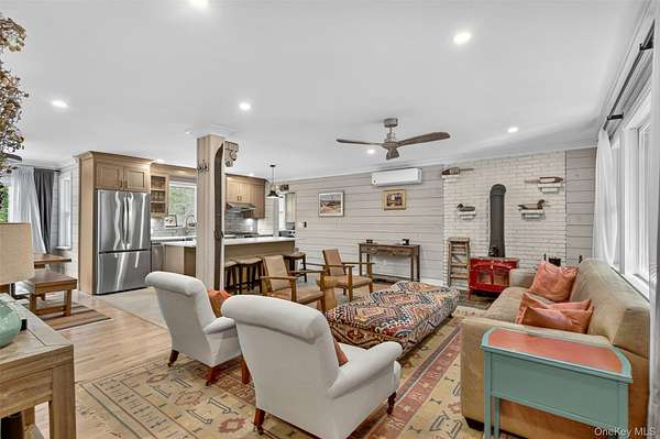 Welcome to your private Hudson Valley sanctuary-an exquisite fully gut-renovated 4-bedroom, 4-bath elevated Cape Cod escape on 24 secluded acres directly bordering the Mohonk Preserve. Set at the end of a quiet country lane, this fully renovated 2,500+ sq ft home combines modern comfort, rustic character, and total privacy. Enjoy woodland and water views from nearly every room, with over 150 feet of elevation gain offering direct access to miles of Preserve trails. The open-concept main level features sunlit living and dining areas, a wood-burning stove, and a chef's kitchen with quartz countertops, solid wood cabinetry, and an expansive island. The lower level includes a second kitchenette and full bath-ideal for guests, extended family, or studio use. Recent upgrades include a new roof, HVAC systems, solid red oak flooring, solid wood doors, updated electrical and plumbing, and over 850 sq ft of finished basement space. A detached accessory structure with high ceilings and electric offers excellent potential for a studio, office, or guest suite. Designed schematic plans are available for further expansion, including converting the main house garage into a great room. With potential for at least two accessory dwelling units (subject to approvals), this property offers both investment value and an exceptional lifestyle-just minutes from High Falls, Rosendale, and New Paltz, and under two hours from NYC.