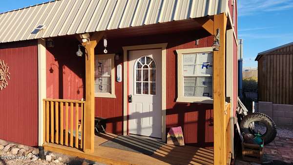 Excellent opportunity to own a well-improved Deeded, vacant lot in Quartzsite with city water and sewer. This property features a 12' x 40' Graceland shed thoughtfully converted into a functional shop/garage complete with a full bathroom, including a full-size shower and water heater. A newer washing machine is installed for added convenience. The impressive 40' x 18' x 14' tall RV cover includes full siding on the south side, providing extra shade and protection from the desert sun. Complete with a 50amp RV hook-up. Low HOA fees include water, sewer, and trash service, making this an affordable and practical option for seasonal visitors or full-time RVers looking for a ready-to-enjoy setup in the heart of Quartzsite.