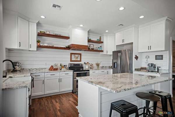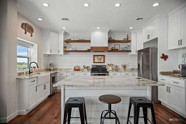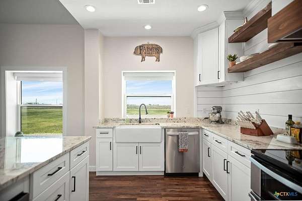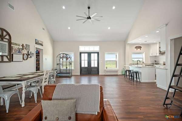 Discover this stunning waterfront barndominium nestled on 39 private acres, offering over 3,000 sq ft of beautifully finished living space. Built in 2024, this custom home blends modern comfort with rustic charm and features spacious front and back porches, perfect for enjoying serene views of the bay. Inside, the gourmet kitchen boasts custom cabinetry, striking granite countertops, open shelving, a designer vent hood, and an abundance of natural light. The expansive living room features soaring vaulted ceilings and a wall of windows overlooking the bay, creating a breathtaking, light-filled space. The luxurious master suite also offers bay views, along with a spa-like bathroom complete with a large walk-in shower, freestanding soaking tub, and dual walk-in closets for him and her. Designed for energy efficiency and comfort, the home includes spray foam insulation and a whole-home dehumidifier, ideal for coastal living. Additional upgrades include fiber internet and utilities (water and electricity) run all the way to the waterfront. The 60x40 shop is equally impressive, featuring two large side overhangs, a full bathroom, and a 500 sq ft climate-controlled tackle room, perfect for hobbies, storage, or workspace. This one-of-a-kind property is a rare find for those seeking space, privacy, and unbeatable waterfront views