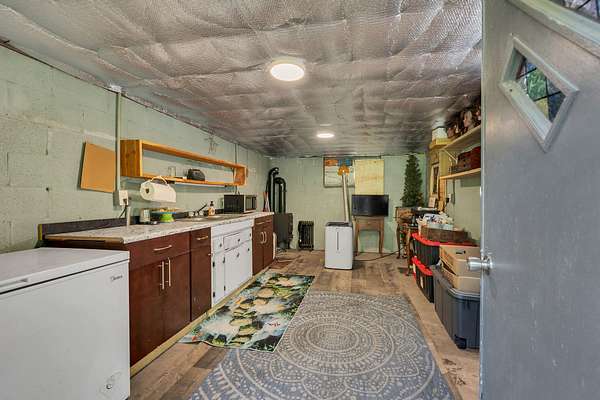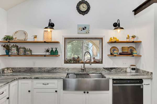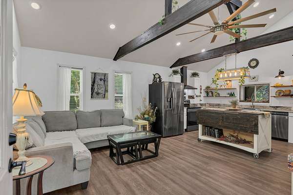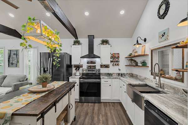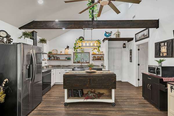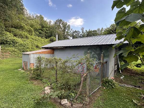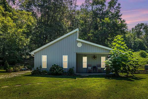 CREEK! SERENITY! 4.56 COUNTRY ACRES! 24'x36' 220 wired shop building with sound studio! Take a look at this adorable custom built home sitting on lush, beautifully landscaped, sit back, relax overlooking your very own creek! This split roof style home features open floor plan, 2'x6' exterior walls, 12 'Vaulted ceiling on west side with stained glass transit windows. Large rustic beams. LVP flooring. Large island with drop down leaf. Disk lights throughout. Beautiful Granite countertops, Stainless appliances all stay. Split Farmhouse stainless sink. Huge mudroom/pantry. Large bedroom with Walkin closet. Large custom tiled wet room, claw foot tub, multi jet shower. High speed fiber internet! 14x23 patio. 12x21 She shed. Wired, plumbed, insulated. 8x20 shipping container, in great condition also available. Storm shelter. Additional shop building. 2 chicken coops. Fruit trees, grape vines. Amish Country but just off main highway.