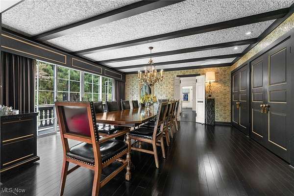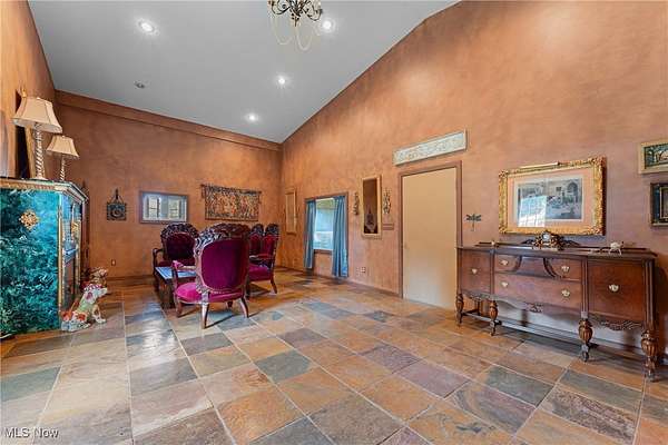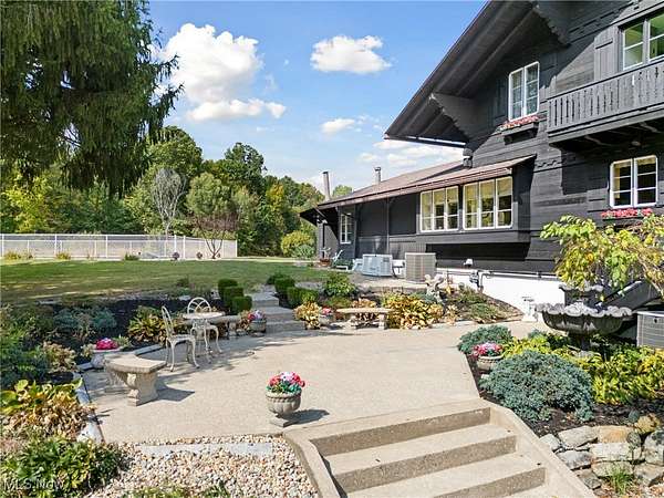 Step into a world of refined luxury and architectural distinction with this extraordinary Swiss Chalet estate, designed by renowned architect Thomas Schroth, who was once featured in Architectural Digest. Nestled on 111 acres, half wooded with valuable timber, this 7,000+ sq ft residence is a rare blend of artistry, craftsmanship, and natural serenity. From the grand foyer, the home reveals its soul. A custom maple library offers a quiet sanctuary, while the formal living room enchants with leaded-glass windows and a stately fireplace. The family room, accented with architectural wood beams and a second fireplace, invites warm gatherings, while the formal dining room with dual built-in china closets opens to a tiered stone terrace for elegant entertaining. The gourmet kitchen features an indoor grill, copper-inset herb garden, and breakfast nook that blends charm with functionality. Upstairs, stained-glass windows illuminate the staircase landings leading to three spacious bedrooms with en-suite baths. The master retreat includes a private balcony, spa-inspired bath, and dressing room, while third-floor bedrooms enjoy balconies with sweeping estate views. Amenities include a heated saltwater pool, 4 story elevator shaft (electric-ready), wine cellar/bomb shelter, whole-house generator, dual furnaces and A/C units, automatic closet lighting, built-in drawers, breezeway for summer dining, and a seven-car garage. The pull-through horse barn offers a stall, heated sitting room with half bath, four fenced pastures, automatic waterers, and a tranquil creek winding through the grounds. Recent updates include a new hot water tank (2025), well bladder tank (2022), freshly painted exterior and windows (2024), commercial-grade driveway repaving (2025), terrace wall restoration, barn gravel refresh, and new gas line. This is more than a home-it is a legacy estate where architectural excellence meets the tranquility of nature.