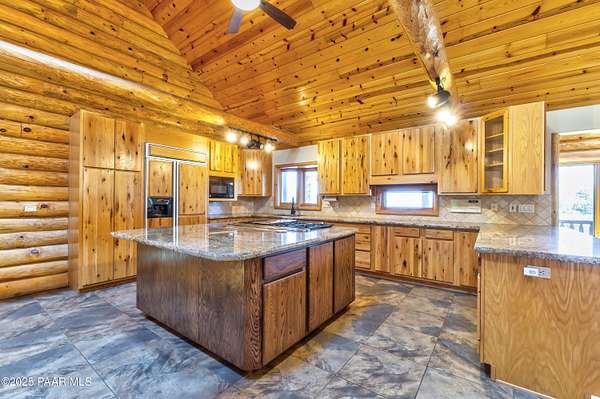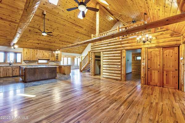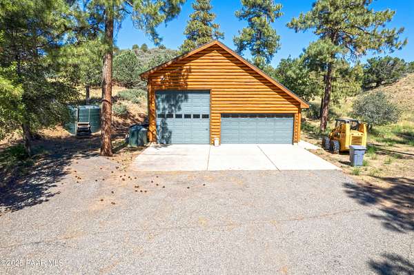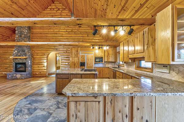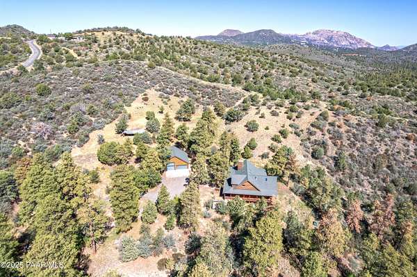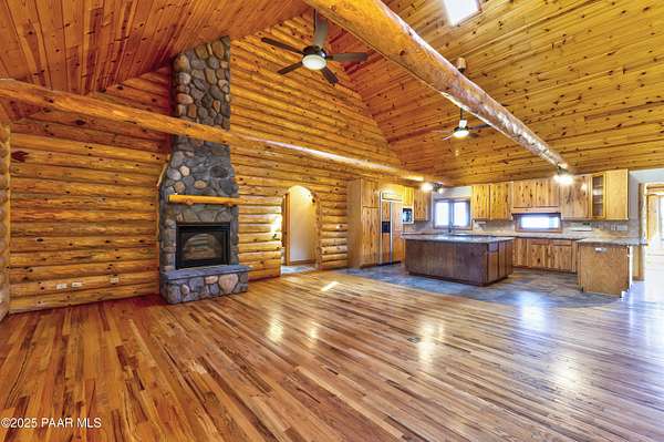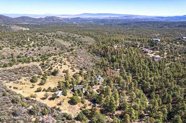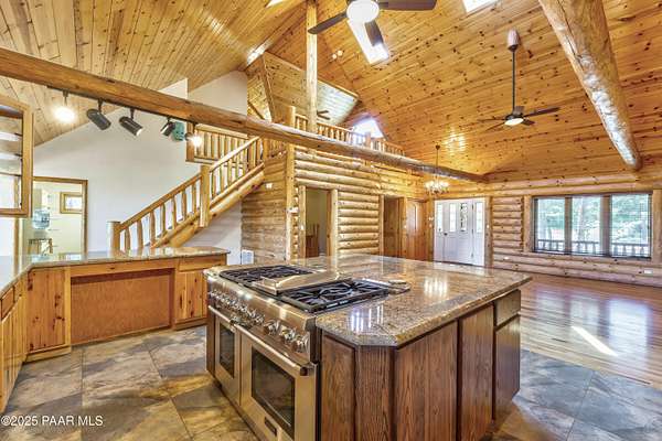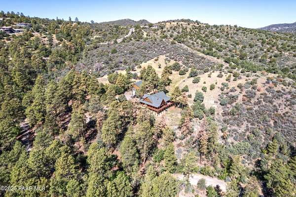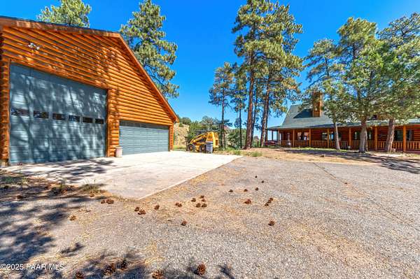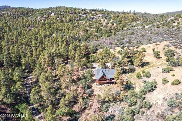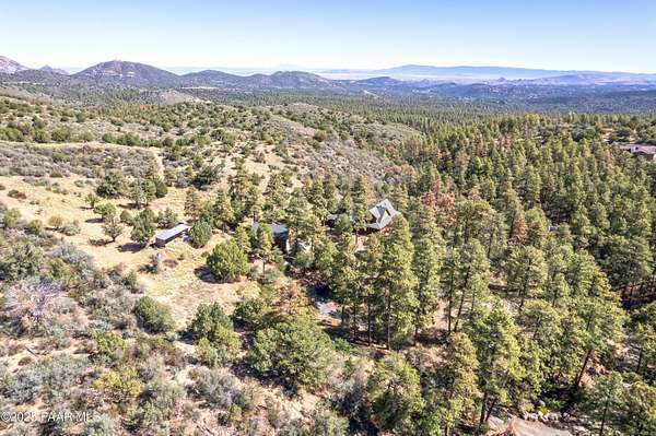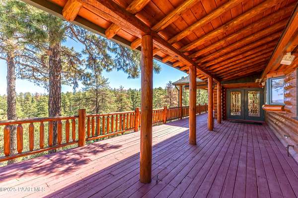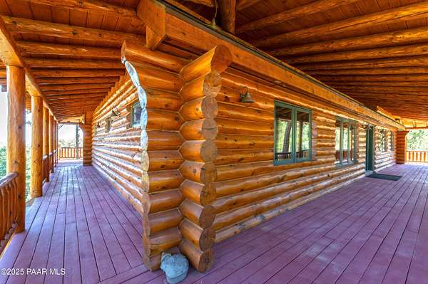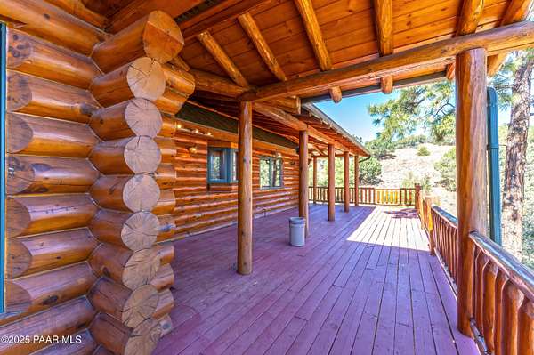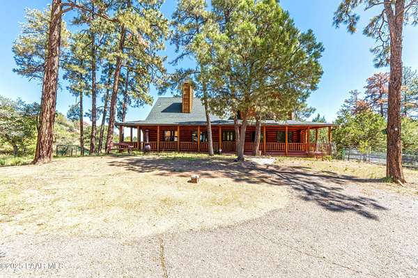 Experience timeless mountain living in this extraordinary custom log home, perfectly perched on over 5.4 private acres with breathtaking 100-mile views of the San Francisco Peaks and beyond. Nestled against the Prescott National Forest, this one-of-a-kind property offers unparalleled privacy, direct trail access, and luxury craftsmanship at every turn.Step through an artistic gated entry, adorned with impressive wildlife sculptures, and enter a world where rustic charm meets refined elegance. Built with classic post and beam construction, the home features cathedral ceilings in the great room, exposed beams, and tongue-and-groove pine-clad ceilings that highlight the home's warm, natural beauty.The heart of the home is a chef's dream kitchen, fully equipped with a 6-burner Thermador range with double convection ovens, a built-in refrigerator with custom wood panel fronts, Bosch dishwasher, and a massive granite island ideal for meal prep and entertaining. Whether you're hosting guests or enjoying a quiet evening, the expansive dining area surrounded by windows brings the outdoors in with stunning natural light and views.The owner's suite is a true retreat, featuring an ensuite walk-in closet and a luxuriously appointed bathroom. Two additional guest bedrooms and a full guest bath provide comfort and space for family or visitors. A versatile loft area with a 3/4 bathroom offers endless possibilities--from a media room to a home office or additional sleeping quarters.Enjoy year-round outdoor living on the expansive wraparound cedar porch, perfect for relaxing with a morning coffee or entertaining with sunset views.Car enthusiasts and adventurers alike will love the massive 6-car garage/RV barn, complete with RV hookups, plumbing for heat, and ample room for toys, tools, and gear.The rear of the property features flat, usable land with a 4-stall mare motel, ideal for horse lovers and equestrians. With direct access to the national forest, saddle up and ride out onto miles of scenic trails right from your backyard.