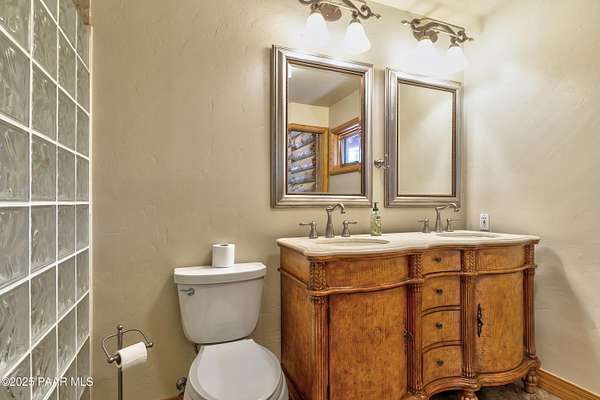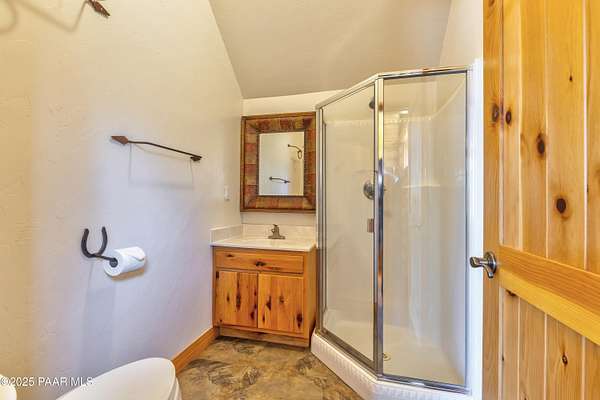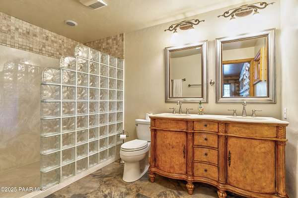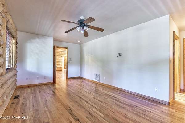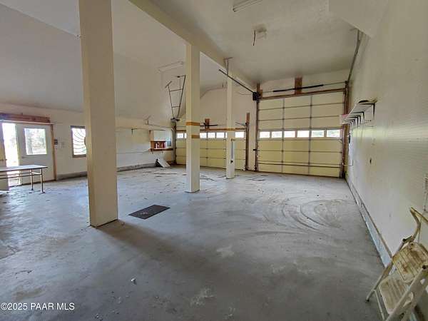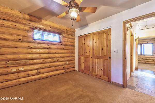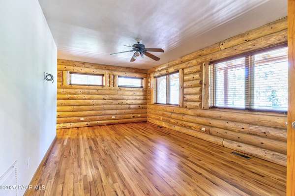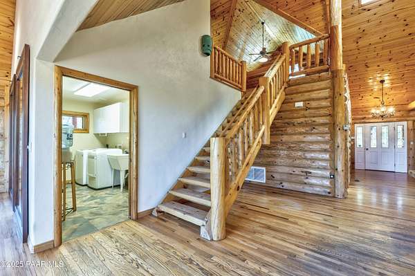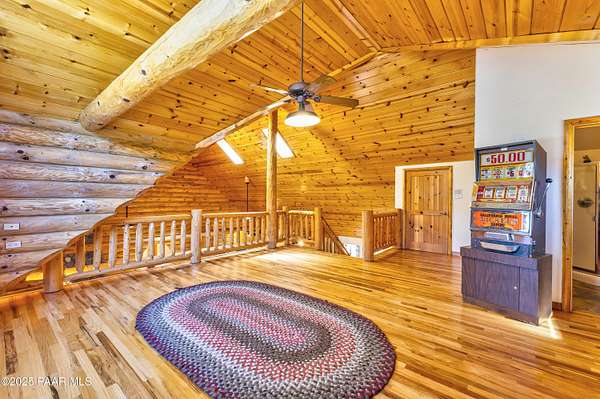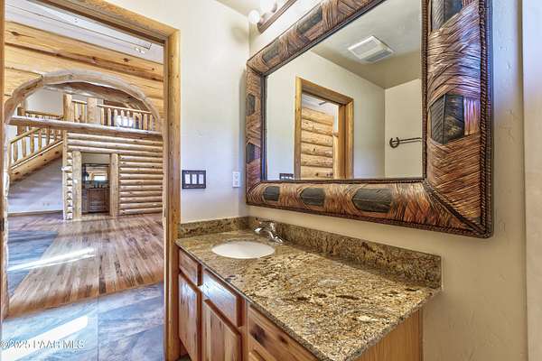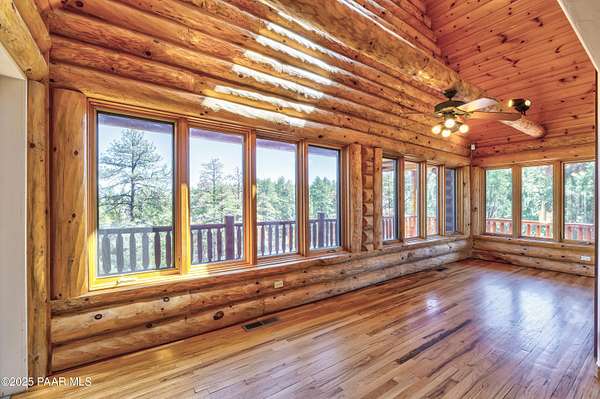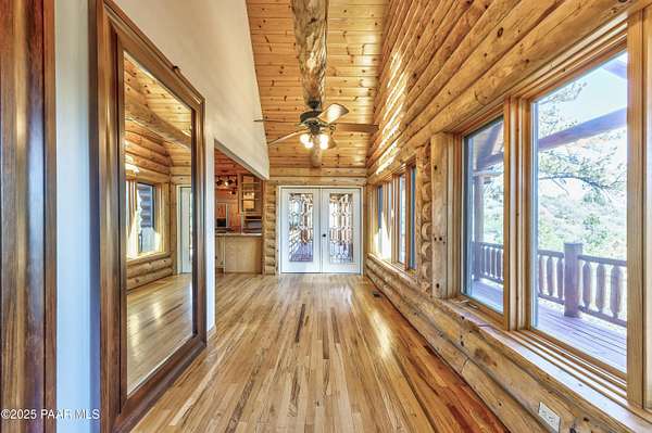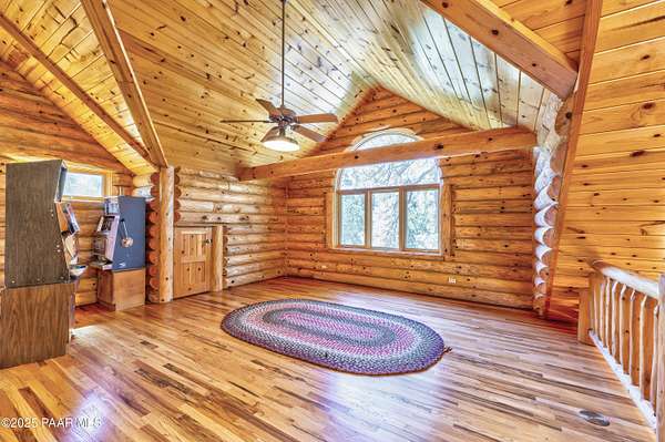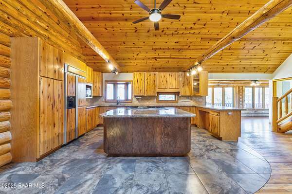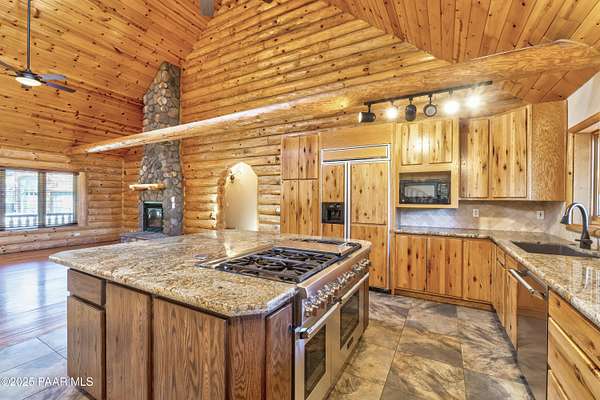 Experience timeless mountain living in this extraordinary custom log home, perfectly perched on over 5.4 private acres with breathtaking 100-mile views of the San Francisco Peaks and beyond. Nestled against the Prescott National Forest, this one-of-a-kind property offers unparalleled privacy, direct trail access, and luxury craftsmanship at every turn.Step through an artistic gated entry, adorned with impressive wildlife sculptures, and enter a world where rustic charm meets refined elegance. Built with classic post and beam construction, the home features cathedral ceilings in the great room, exposed beams, and tongue-and-groove pine-clad ceilings that highlight the home's warm, natural beauty.The heart of the home is a chef's dream kitchen, fully equipped with a 6-burner Thermador range with double convection ovens, a built-in refrigerator with custom wood panel fronts, Bosch dishwasher, and a massive granite island ideal for meal prep and entertaining. Whether you're hosting guests or enjoying a quiet evening, the expansive dining area surrounded by windows brings the outdoors in with stunning natural light and views.The owner's suite is a true retreat, featuring an ensuite walk-in closet and a luxuriously appointed bathroom. Two additional guest bedrooms and a full guest bath provide comfort and space for family or visitors. A versatile loft area with a 3/4 bathroom offers endless possibilities--from a media room to a home office or additional sleeping quarters.Enjoy year-round outdoor living on the expansive wraparound cedar porch, perfect for relaxing with a morning coffee or entertaining with sunset views.Car enthusiasts and adventurers alike will love the massive 6-car garage/RV barn, complete with RV hookups, plumbing for heat, and ample room for toys, tools, and gear.The rear of the property features flat, usable land with a 4-stall mare motel, ideal for horse lovers and equestrians. With direct access to the national forest, saddle up and ride out onto miles of scenic trails right from your backyard.