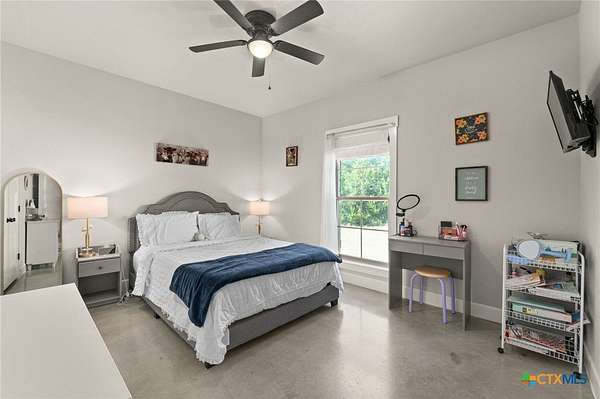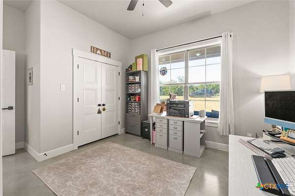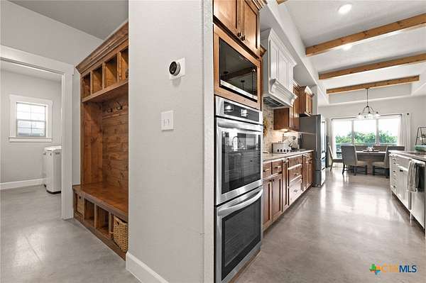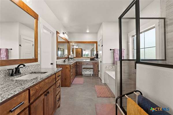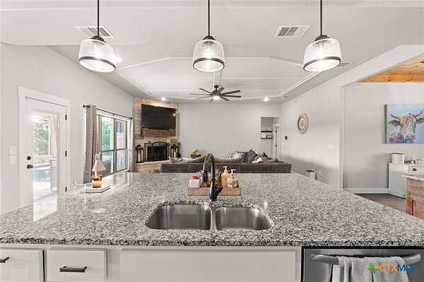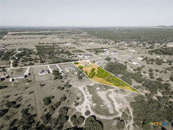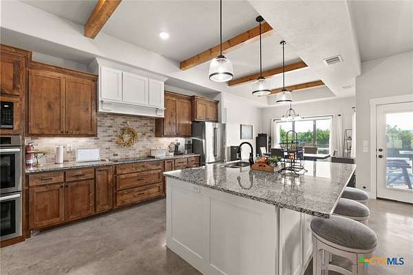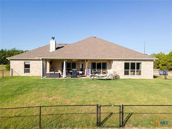 Welcome to this country home enjoying no rear neighbors 4 bedrooms, 2.5 bathrooms, on 1.93 acres, located outside the city limits with no HOA. An open concept living space enhanced by crown molding ceilings and a limestone fireplace. The chef's kitchen includes, wood beams, granite countertops, double ovens, a wonderful island for family gatherings, a walk-in pantry, and ample cabinetry, ideal for hosting. Nice size dining area off the kitchen. The primary suite offers luxury with wood plank ceilings, granite his and her sinks, a jetted tub, a separate shower, and a walk-in closet. Three good sized versatile bedrooms. Utility room has a sink and cabinets. A built-in area for coats, shoes etc., a covered patio area for BBQing, chain-link area in the back and a 2-car garage, complete this modern, elegant home set in a tranquil environment. Don't miss the opportunity to own this exceptional property focused on comfort and style. Great location 15 minutes from HEB/Walmart. All measurements are estimates.