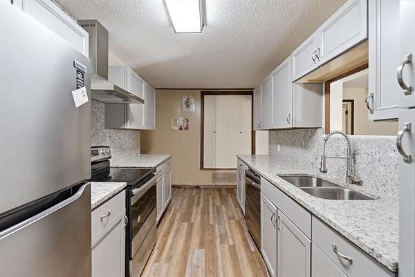 The galley-style kitchen is perfectly positioned between both living spaces and has been completely updated with brand-new cabinetry, granite countertops, new sink and dishwasher, updated fixtures, and vents, creating a practical and polished space.