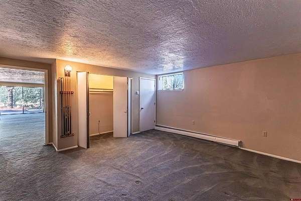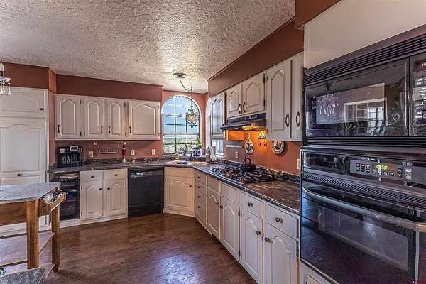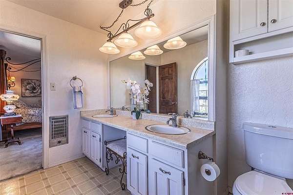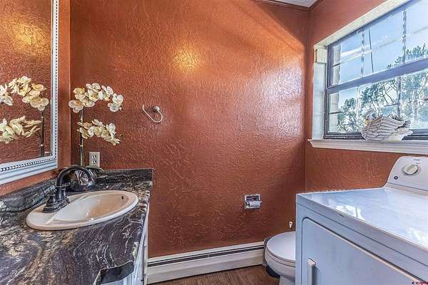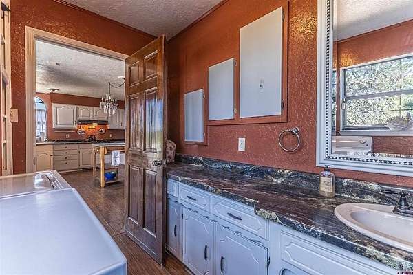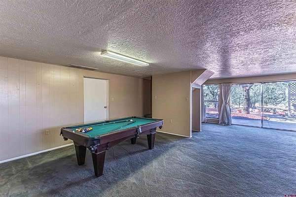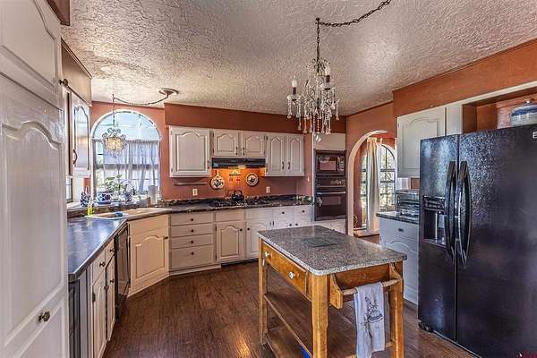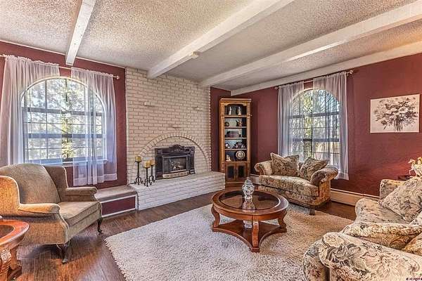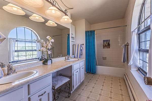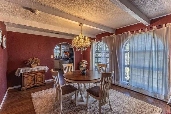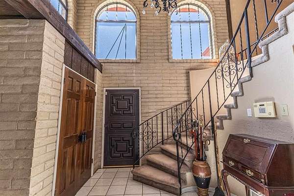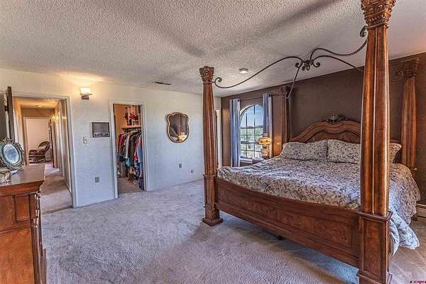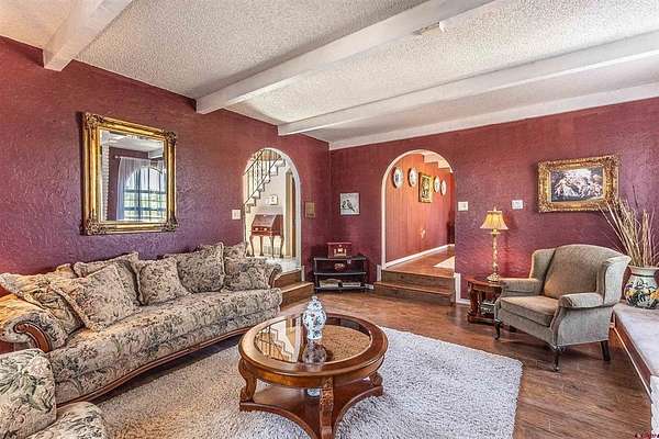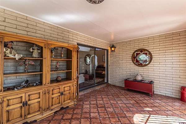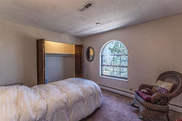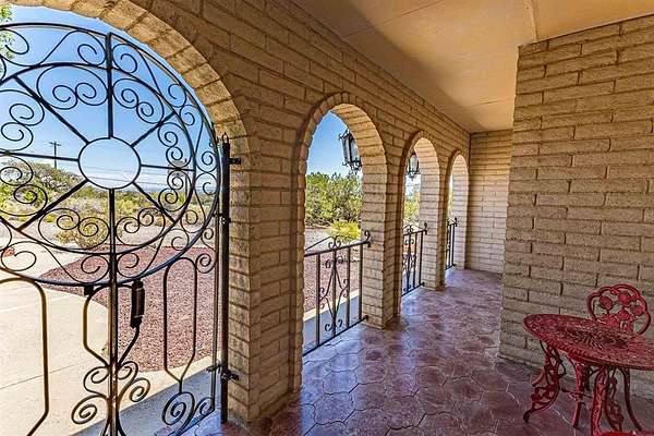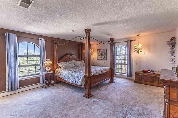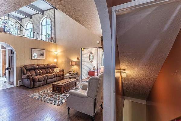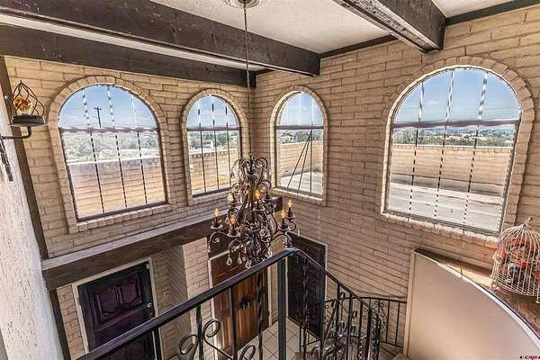 Allen Elmore, eXp Realty, LLC, C: 505-686-3831, Allen@AE.Properties, www.crenmls.com: ''Round About'' Discover timeless charm and impressive space in this stunning Spanish-style brick home, where craftsmanship and architectural detail abound. Arched windows and doors, exposed beams, and solid wood finishes create an ambiance that is both elegant and inviting. Enjoy peaceful moments in the shaded front porch or private atrium, and take in sweeping views from the upper-level veranda and composite deck. Step into a grand foyer with chandelier and curved staircase leading to a mezzanine-style catwalk that connects four spacious upstairs bedrooms. The sunken living room features rich wood accents and a gas fireplace insert. A formal dining room with chandelier adds sophistication, while the kitchen offers custom cabinetry, a pantry, 5-burner gas cooktop, raised oven, microwave, wine fridge, dishwasher, and refrigerator with ice. The kitchen connects to an elevated deck with views--perfect for entertaining. The upstairs primary suite boasts veranda access, panoramic views, a large closet, and an en suite bath with dual sinks and tub/shower combo. Three additional bedrooms share a full bath with a tub/shower combo and also enjoy great views. The finished basement offers tremendous versatility with a large living and recreation space, wood stove, full kitchen, and oversized bedroom--ideal for multi-generational living or guest quarters. There's also a spacious laundry room with half bath, finished sunroom with HVAC, and a secure cellar for storage. Modern updates include a new evaporative cooler and a $13K radiant heating system upgrade. Outside you'll find a 2-car garage, RV parking, pole barn, metal shed, and garden beds with sprinklers, all within a fully fenced backyard.