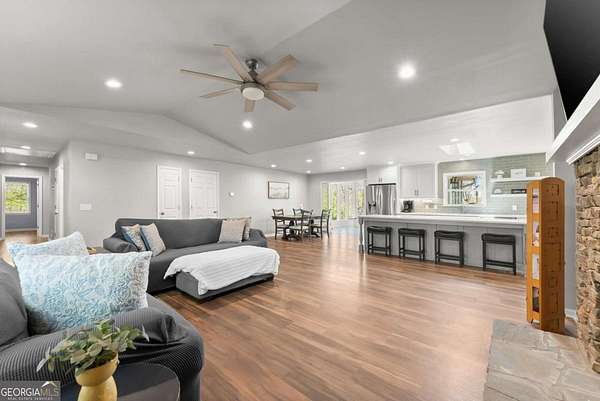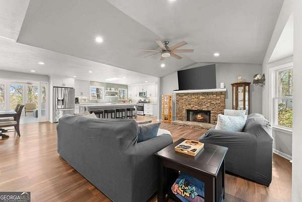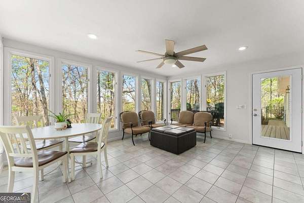 Hard to Find One Level Ranch Home on 8.08 Private Acres with Seasonal Mountain Views Minutes from GA400 & Outlet Mall! Welcoming Front Porch Invites Guests into Heart of Home That's Been Lovingly Renovated Into a Spacious Bright Open Concept Floorplan. Great Room w/Stacked Stone Fireplace, Raised Hearth and Bay Window Overlooks the Front of the Home. Renovated Chef's Kitchen including Oversized Island, Quartz Counters, Copious Cabinets w/Custom Lightning and Walk-in Pantry. Dining Area Opens to Light Filled Sunroom with Glass French Doors and Picturesque Nature Views. Oversized Primary Suite has Two Separate Large Walk-in Closets, Make-up Vanity Area, Large Spa Bath with Separate Vanities, Corner Tub and Separate Shower. Spacious Secondary Bedrooms Each w/Large Closets Share Full Bath off Hallway. New Lighting, Ceiling Fans, Paint and Flooring Throughout. Powder Room and Huge Laundry/Mudroom with Built-in Cabinets Located Off Hallway to Side-Entry Oversized 2 Car Garage that is Approx 30' deep includes workbench and walled peg boards for storage. Huge Unfinished Basement with Garage Door. Large Back Deck Overlooks Fenced Backyard. True Circular Driveway Provides Plenty of Room to Park RV and Extra Cars.