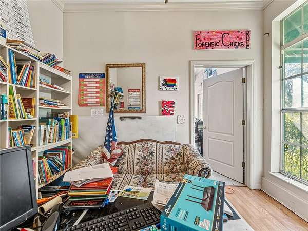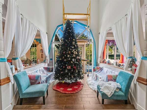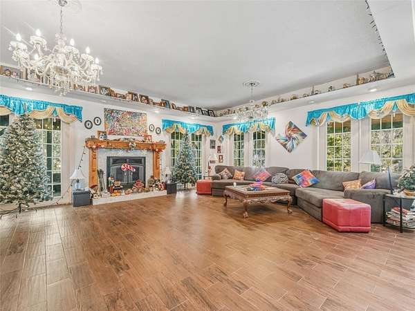 The main residence features 3 bedrooms and 3 bathrooms with high ceilings, abundant natural light, and custom architectural details. The entry showcases marble flooring and a double oak winding staircase. The great room includes a tray ceiling, wood-burning fireplace, and stone-style plank tile flooring replaced in 2020, with views of the backyard pool area. The kitchen offers solid wood cabinetry, stainless steel appliances, granite countertops, and opens to the formal dining room. Additional spaces include a custom wood library with built-ins, a conservatory, private office, atrium, and a large wraparound porch.
