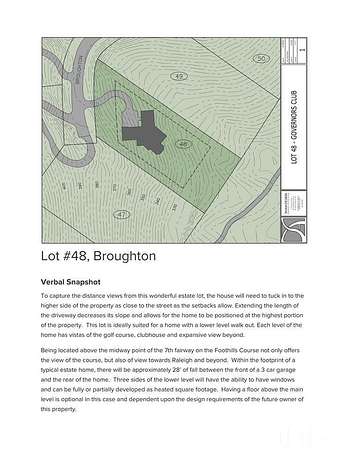 Est $1,492/moGolf Course VIEW. Excellent value in Governors Club. Exciting opportunity to build your dream home with a full walk-out Lower Level. This huge (0.87 acre), downward sloping, lot will accommodate your cascading home (Transitional with Lower Level/workshop: CA Contemporary w/floor to ceiling glass walls for your private views). Broughton road is the home to many stunning estates. Bring your own builder OR select one of the great Governors Club, Custom Home Builders. Close to UNC,RTP,RDU,and Duke, and great medical!