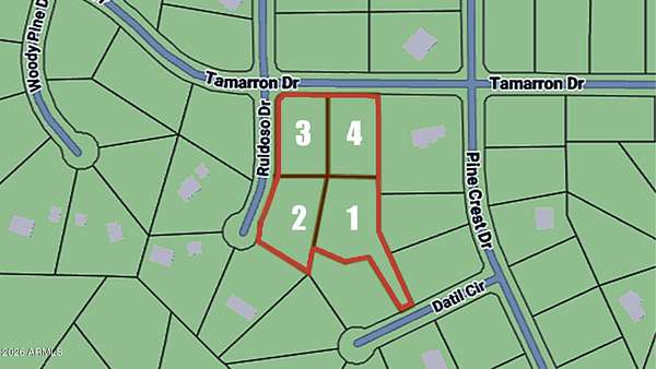 From SR 87 & Starlight Dr., go E on Starlight Dr., 1st Right go S on Arapaho Dr., 1st Left go E on Tamarron Dr., lots begin on the SE corner of Tamarron Dr. & Ruidoso Dr. To reach the SE entrance, continue E on Tamarron Dr., Right on Pine Crest Dr., Right on Datil Cir. Property is on the Right, North side of Datil Cir.