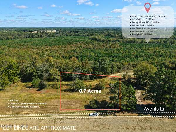 Discover this rare 0.7-acre homesite in quiet Nash County, perfectly situated just 10 minutes from Downtown Nashville, 20 minutes from Rocky Mount, and about an hour from Raleigh. This nearly level parcel offers excellent build-ability with 160 ft of private road access on Avents Ln. 2-bedroom septic system is already installed, and the well-drained soil supports a strong foundation for your dream home or investment build. Zoned A1, allowing stick-built, modular, or manufactured housing. With 0% wetlands, 0% flood zone, and no HOA, you'll enjoy freedom and peace of mind. Schedule a visit today and imagine your future here!