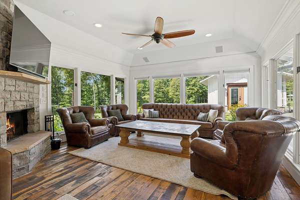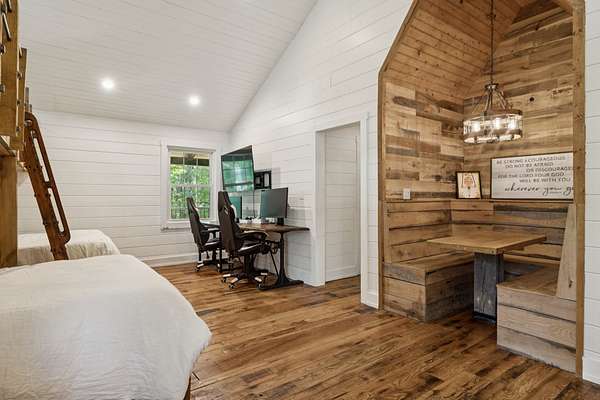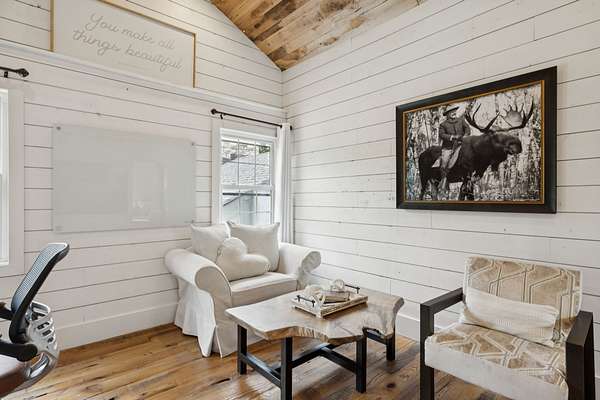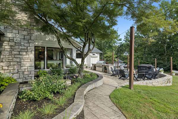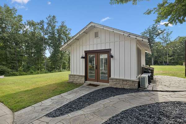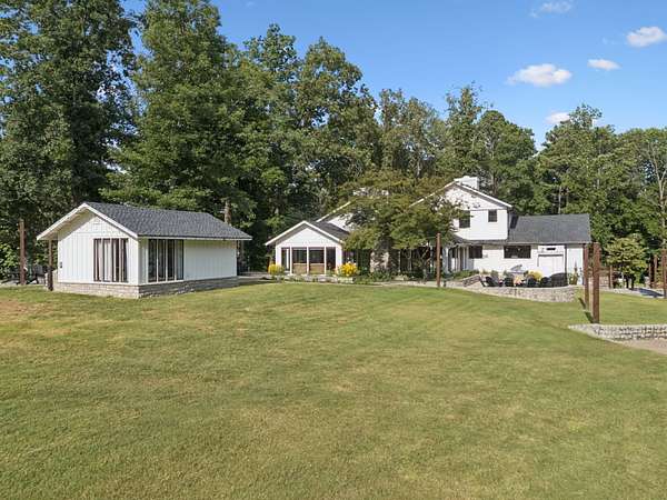 The second-level owner’s suite provides a private retreat with a large walk-in shower and dedicated office. Outdoor living is a standout with multiple patios, fire pits, and a built-in grilling area designed for gatherings. Additional improvements include a 23’x30’ heated/cooled cottage (ideal for studio or office) and a 21’x16’ climate-controlled building currently used as a gym. Ample parking for guests and events.