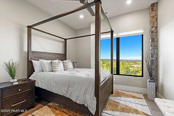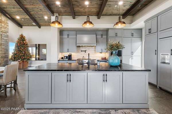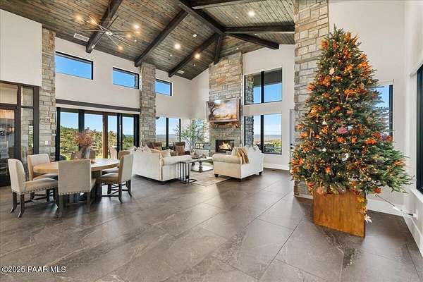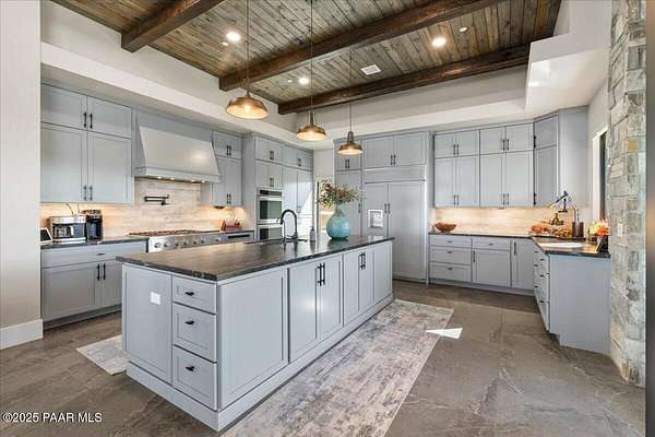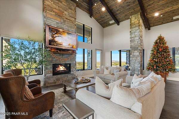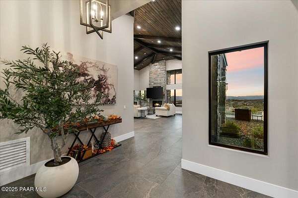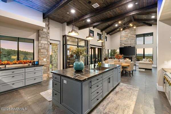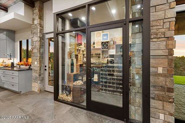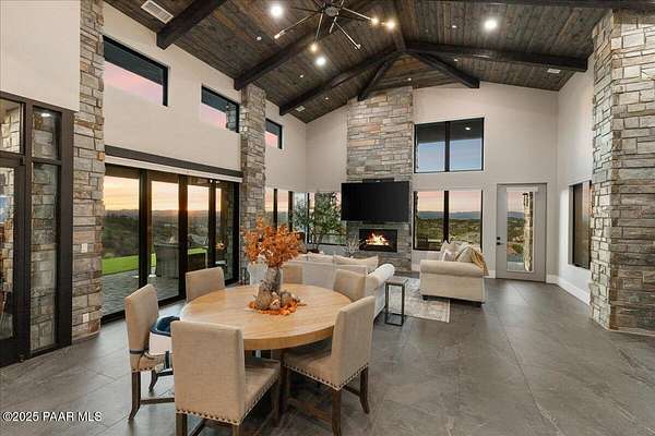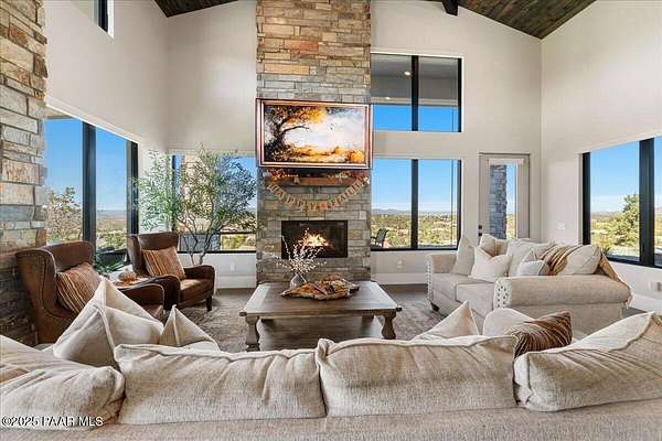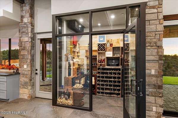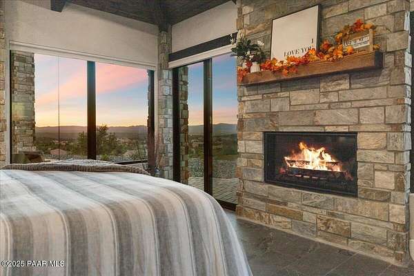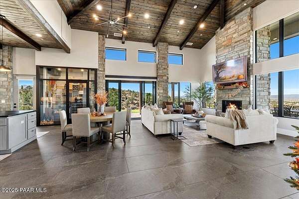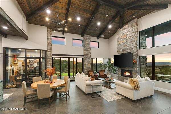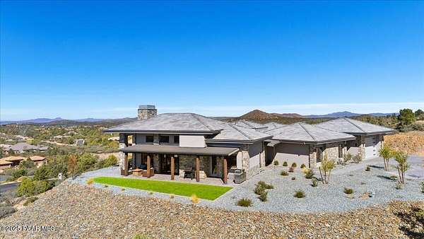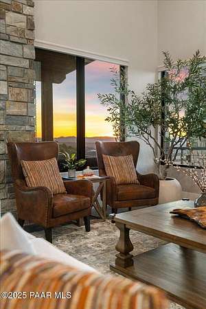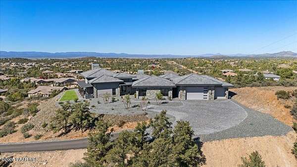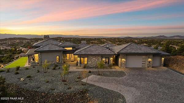 Nestled in the prestigious Whispering Canyon community of Williamson Valley, this exceptional single-level estate exemplifies luxury, privacy, and timeless design. Perfectly positioned on a level 1.97-acre ridge, the residence captures sweeping, unobstructed mountain and long-distance views that truly set the scene.Thoughtfully designed for comfort and sophistication, the home offers five spacious en-suite bedrooms and five-and-a-half baths. The expansive layout blends warm mountain-modern style with high-end finishes throughout. The gourmet kitchen is an entertainer's dream, highlighted by exquisite leather-pressed marble countertops, premium Monogram built-in appliances, and a temperature-controlled wine cellar. Striking beamed ceilings, real stone accents, and imported Italian porcelain flooring elevate the living spaces, while Milgard clerestory windows with power blinds flood the interior with natural light.The primary suite is a serene retreat with stunning views, a stone fireplace, and a spa-inspired bath with designer finishes. A hidden room adds an element of intrigue and privacy a" perfect for a safe room or discreet storage.Multiple patios and thoughtfully placed seating areas capture dramatic sunsets and peaceful desert scenery. The grounds are professionally landscaped with a drip irrigation system, blending convenience with natural beauty.The oversized 3.5-car garage offers generous room for vehicles, outdoor toys, and storage, accommodating an adventurous lifestyle.A rare offering combining luxury, craftsmanship, and panoramic views in one of Williamson Valley's most sought-after communities. Come experience Whispering Canyon and make this extraordinary home your own.