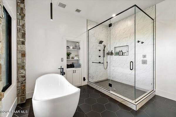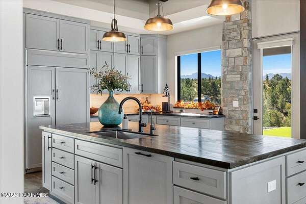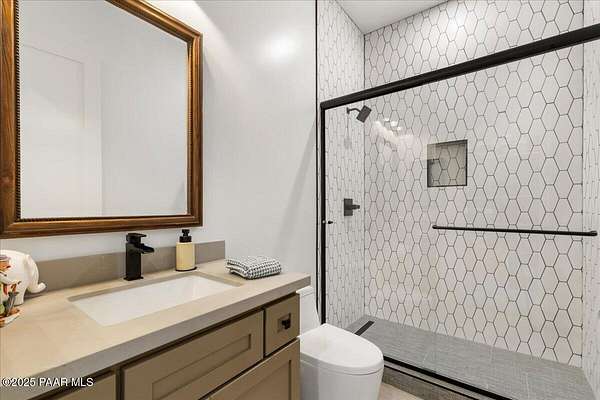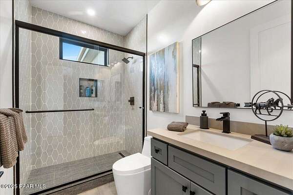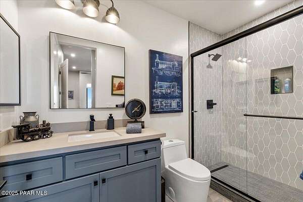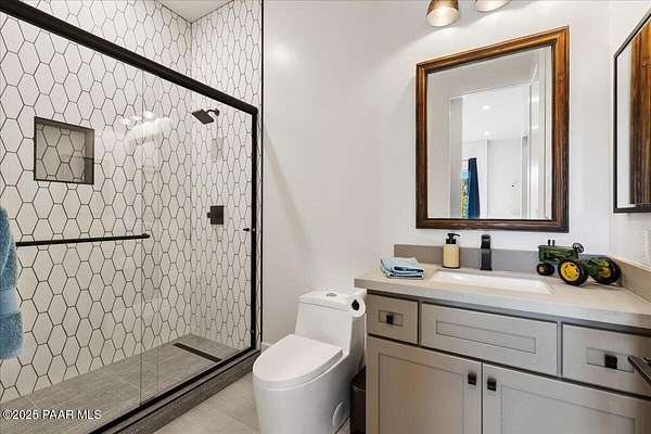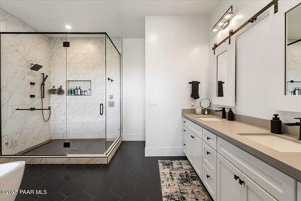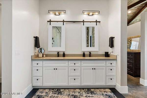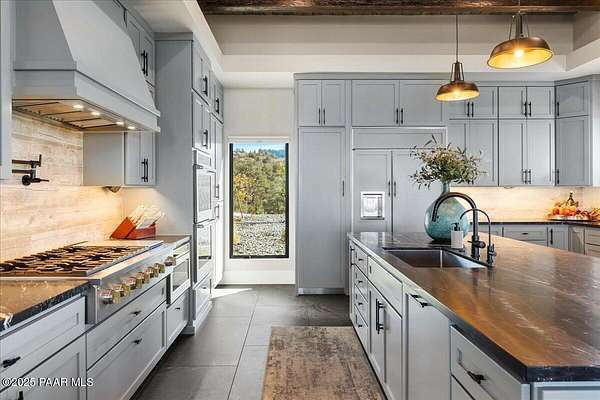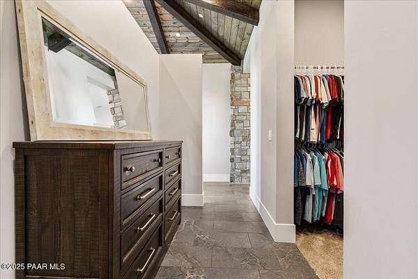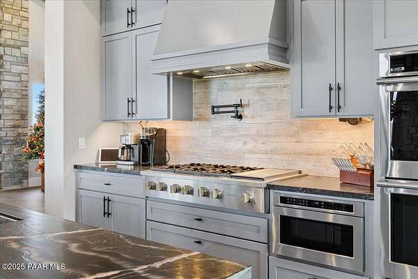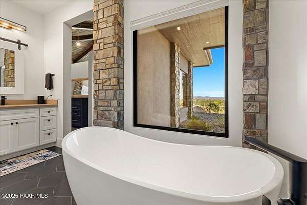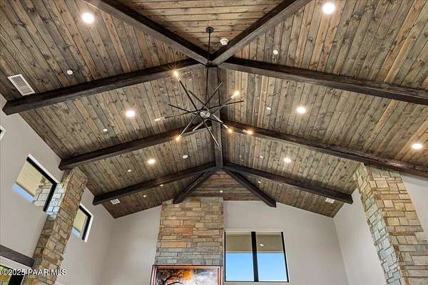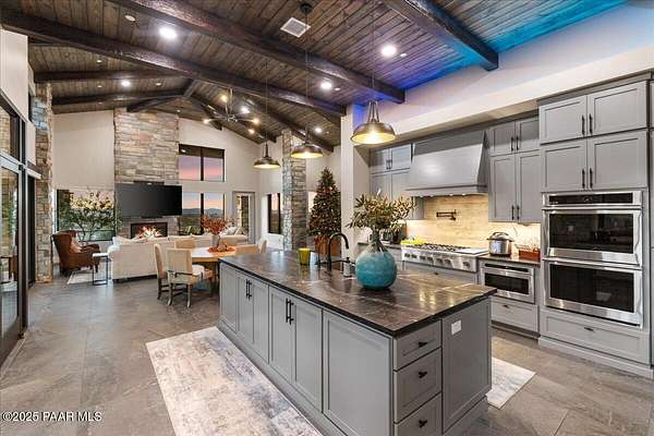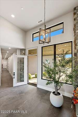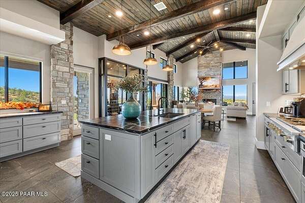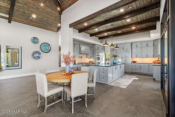 Nestled in the prestigious Whispering Canyon community of Williamson Valley, this exceptional single-level estate exemplifies luxury, privacy, and timeless design. Perfectly positioned on a level 1.97-acre ridge, the residence captures sweeping, unobstructed mountain and long-distance views that truly set the scene.Thoughtfully designed for comfort and sophistication, the home offers five spacious en-suite bedrooms and five-and-a-half baths. The expansive layout blends warm mountain-modern style with high-end finishes throughout. The gourmet kitchen is an entertainer's dream, highlighted by exquisite leather-pressed marble countertops, premium Monogram built-in appliances, and a temperature-controlled wine cellar. Striking beamed ceilings, real stone accents, and imported Italian porcelain flooring elevate the living spaces, while Milgard clerestory windows with power blinds flood the interior with natural light.The primary suite is a serene retreat with stunning views, a stone fireplace, and a spa-inspired bath with designer finishes. A hidden room adds an element of intrigue and privacy a" perfect for a safe room or discreet storage.Multiple patios and thoughtfully placed seating areas capture dramatic sunsets and peaceful desert scenery. The grounds are professionally landscaped with a drip irrigation system, blending convenience with natural beauty.The oversized 3.5-car garage offers generous room for vehicles, outdoor toys, and storage, accommodating an adventurous lifestyle.A rare offering combining luxury, craftsmanship, and panoramic views in one of Williamson Valley's most sought-after communities. Come experience Whispering Canyon and make this extraordinary home your own.