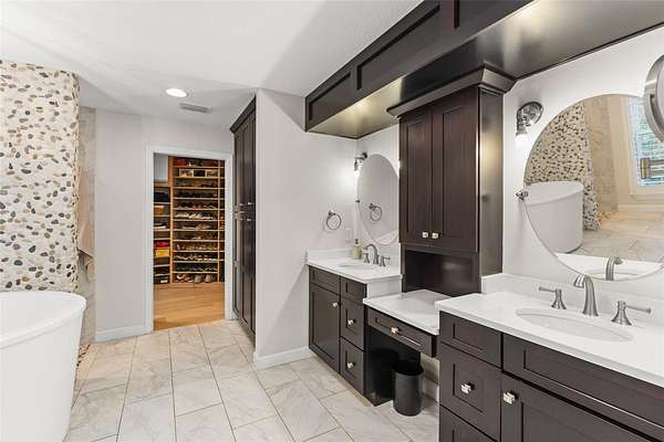 The main level's thoughtfully designed primary suite offers serene seclusion with a private sitting area, spa-inspired bathroom, and expansive walk-in closet, complemented by a convenient main-floor office. Upstairs, five additional oversized bedrooms, a versatile loft, dedicated gym, and stunning rooftop deck provide space for every lifestyle need. Recent upgrades give you the ultimate peace of mind, including upgraded lighting throughout, a new roof with GAF Golden Pledge 20 year workmanship warranty, three newer A/C units, updated water heater, Hayward pool heater, new dock motor, new sprinkler system with a lake-fed pump, and a transferable Massey termite bond. Minutes from Disney's back gates, top-tier schools, and Windermere's celebrated shopping and dining, yet completely private and serene--this is lakefront living without sacrifice. Your Kelso compound awaits!