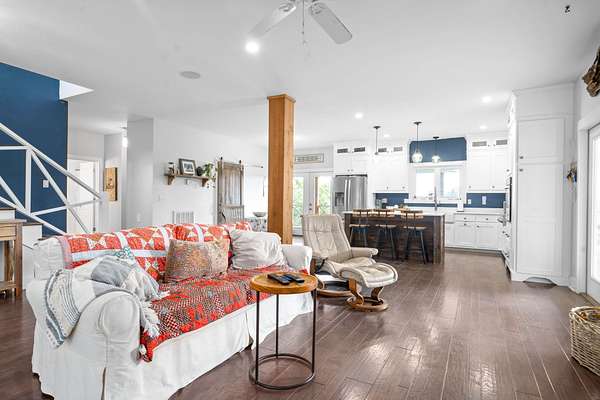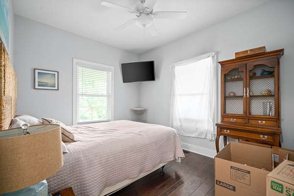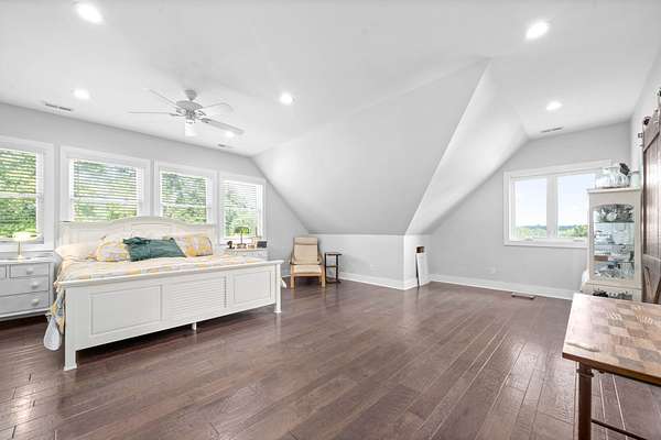 Upstairs, the primary suite (19' x 34') boasts gleaming hardwood floors and large picture windows overlooking the scenic landscape -- a perfect spot to take in the local wildlife. The primary bath offers a walk-in tiled shower, deep soaking tub, and a spacious walk-in closet conveniently accessed from the bathroom.