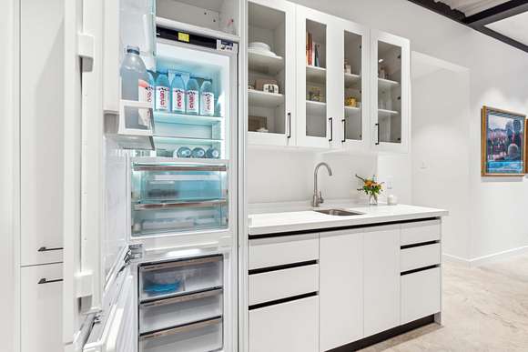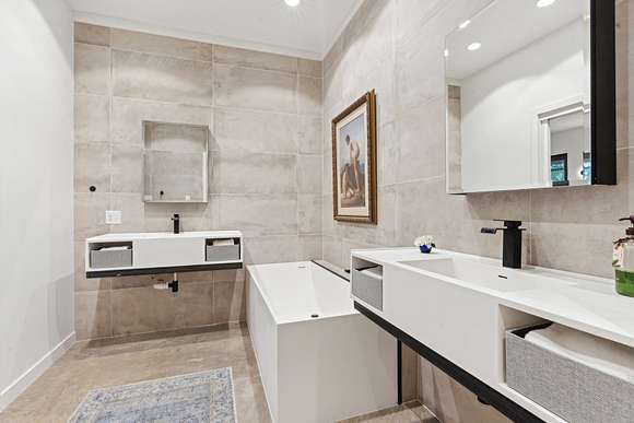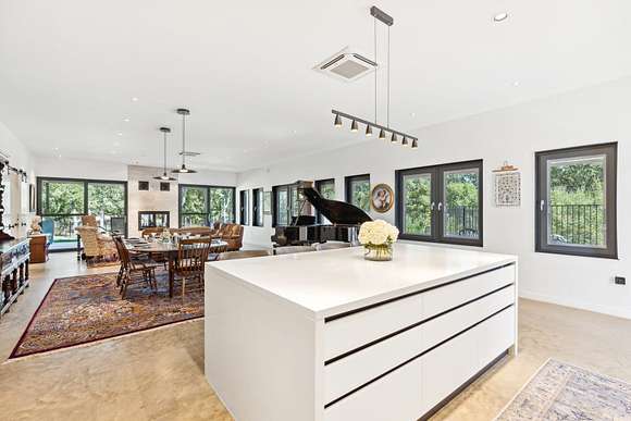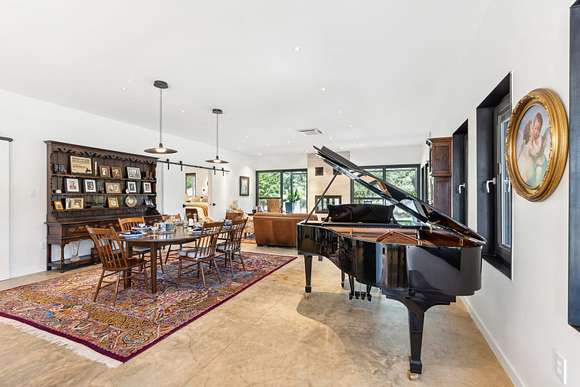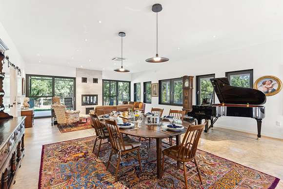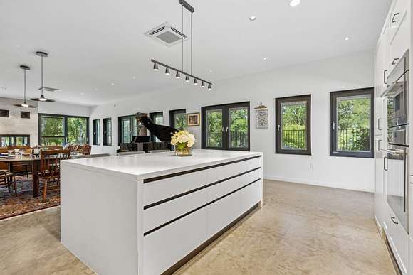 The spacious primary suite features a large steam shower, soaking tub, and dual walk-in closets. An open-concept kitchen, dining, and gathering area is framed by a wall of windows and anchored by a striking indoor/outdoor fireplace. The chef's kitchen boasts a large quartz island, custom cabinetry with abundant storage, and top-of-the-line Miele, Liebherr, and Thermador appliances. A glass-enclosed dining room offers an additional, elegant setting for meals.