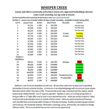 IMAGINE - this lot, along with a small number of others available, are wonderfully unique in so many ways. There are so many people who aspire to build a home in the country - hoping to have a larger amount of land, some privacy, perhaps an outbuilding for many different reasons. Unfortunately, the process to accomplish this feat is long, expensive, and a daunting task, with most applications being rejected. With septic system requirements so stringent and the cost of infrastructure improvements becoming so cost prohibitive, we created Whisper Creek - we're trying to bridge that gap! The development is open to all builders; so whether you have your builder chosen or not, we're here to assist you, every step of the way. Drive-by the development and see for yourself how beautiful these lots literally are. You can find this two-street neighborhood off Tonkel Rd roughly 4 miles north of Dupont Rd between Hosler Rd (to the south) and Schlatter Rd (to the north). Need financing, ask us about that as well, and we'll connect you with the best options available for your situation. We were fortunate enough to create a similar type of subdivision back in the late 1990's on a smaller scale and it was a great hit. It's time once again to have a repeat scenario with this new luxury micro-community. If you're looking for large lot sizes, picturesque, and natural views, plus the option to have an approved outbuilding - give us a visit.