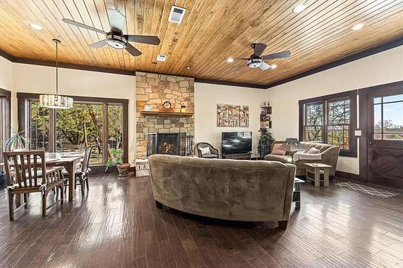 At the heart of the ranch, a charming two-story stone home built in 2017 offers modern comfort with rustic appeal. The home includes two spacious bedrooms, two full baths, and a versatile loft that can serve as a third bedroom or office. Large picture windows illuminate the open-concept living, dining, and kitchen areas, while a wood-burning fireplace adds warmth and character.