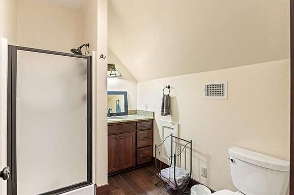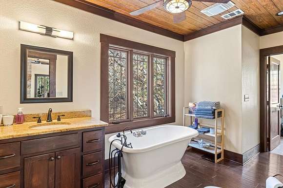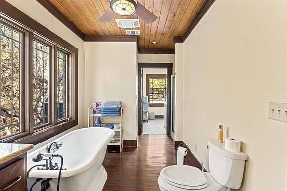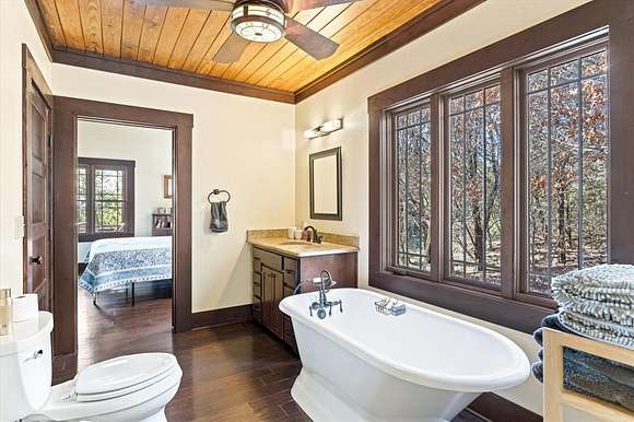 The master suite, along with a full bath and laundry, is conveniently located on the main floor. Upstairs, you'll find a guest bedroom, a second bath, and the loft. Step outside to a covered front porch with ceiling fans--a peaceful retreat for soaking in the scenic surroundings.