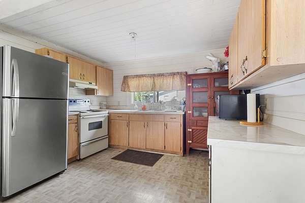 - Eat-In Kitchen, Electric Range, Living Room, Wood Cabinets