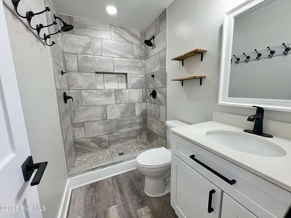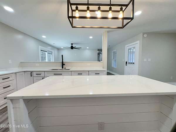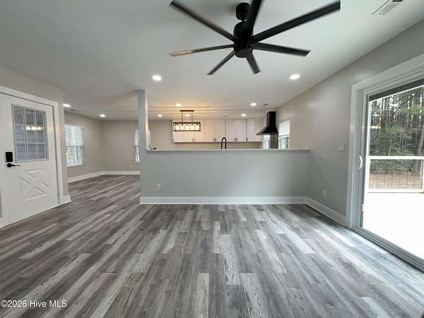 Stunning, Completely Renovated Home on 5.44 Acres in Camden, NC Nestled away from the road, this beautiful three-bedroom, two-bathroom home offers ultimate privacy and tranquility. Set on a generous 5.44-acre lot, with one acre cleared and surrounded by four acres of trees, you'll enjoy seclusion and natural beauty. Inside, the home boasts a bright, open-concept kitchen, living, and dining area. The kitchen features solid stone countertops, a large island perfect for entertaining, and ample space for dining. The living room is spacious and opens up to the backyard through sliding doors, seamlessly blending indoor and outdoor living. Additional highlights include brand-new LVP flooring, recessed lighting, fresh paint, and blinds throughout. The home also features a newer HVAC system for added comfort. The primary suite is a true retreat, with a gorgeous walk-in tile shower, dual shower heads, and a spacious walk-in closet. Each bedroom is generously sized and includes ample closet space. Plus, the property is in a no-flood zone, ensuring peace of mind. Located in the highly sought-after Camden County, NC, this home is also within a top-rated school district, offering an excellent educational environment.