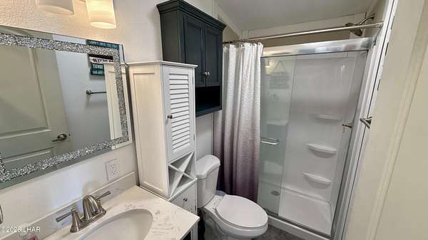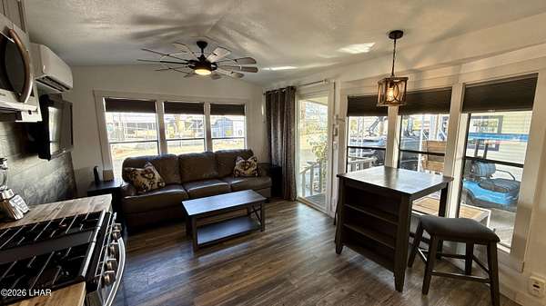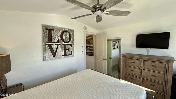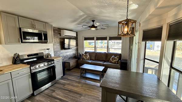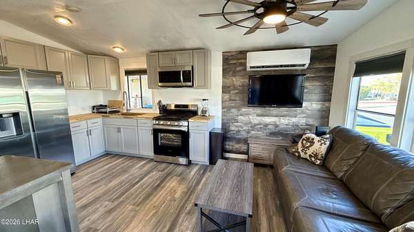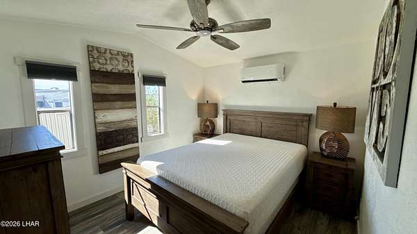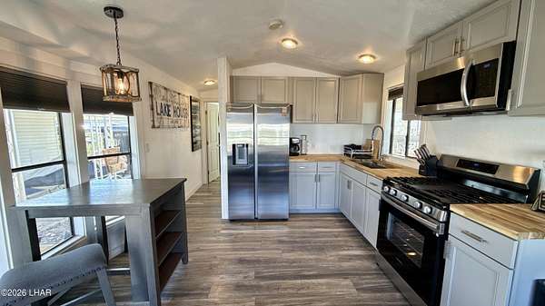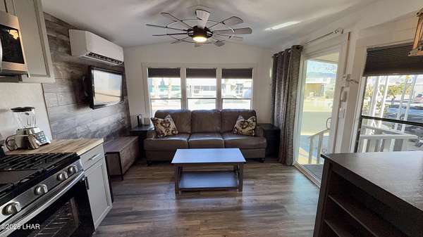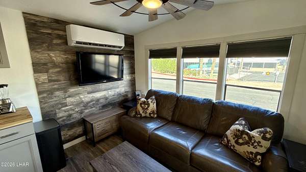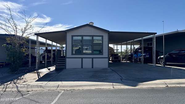 ON LEASED LAND. Located in Sam's Beachcomber on the island in Lake Havasu. Within walking distance to the clubhouse and pool in the center peninsula. This home underwent a head-to-toe renovation inlcuding two new mini-split HVAC's, and comes turnkey furnished for immediate enjoyment. Outdoor shade and space are abundant with full-length covers along both sides. Along the left, a full patio with grilling area, multiple outdoor seating arrangements overlooking the mountains and island views, plus 2 storage sheds at the rear. The right side has full-length covered parking that allows for oversized boat parking, and the unique bonus is the ability to parallel park an additional vehicle or tow rig completely off the street. Inside, you have tasteful earth tones throughout. Laminate wood flooring, new cabinets in the full-size kitchen, stainless steel appliances, and a large single basin sink. There's a new bathroom with a walk-in shower and comfort height vanity & toilet, and LED lighting throughout. Come see this one today.
