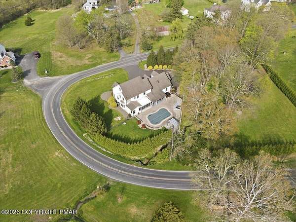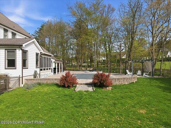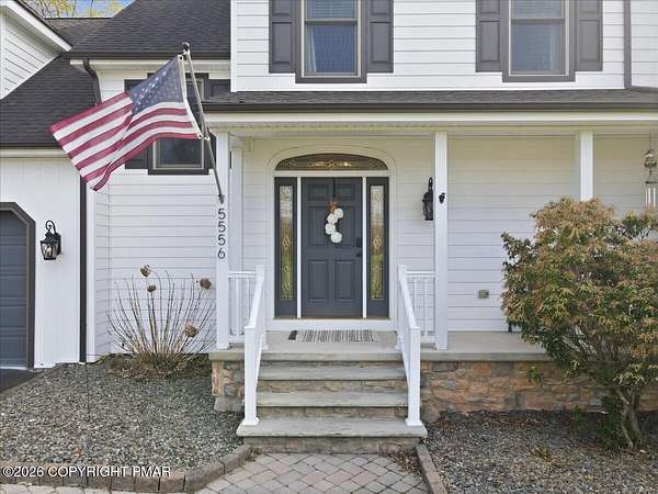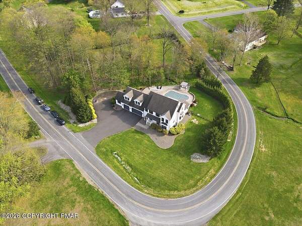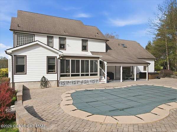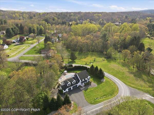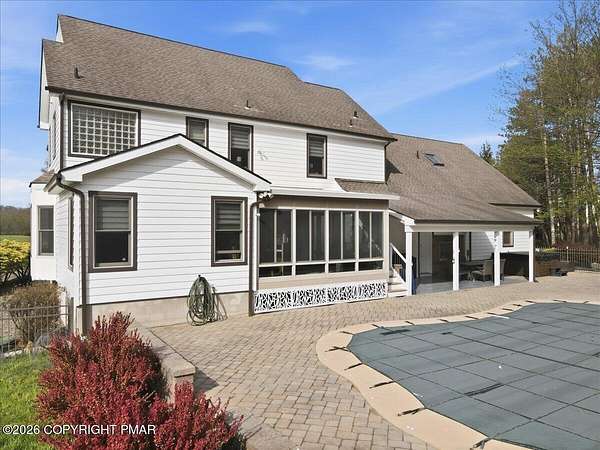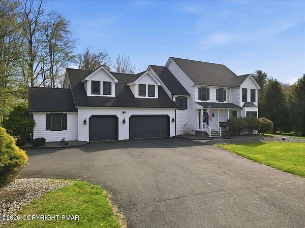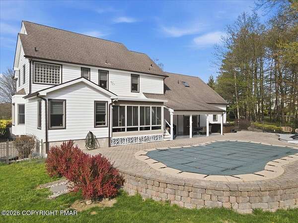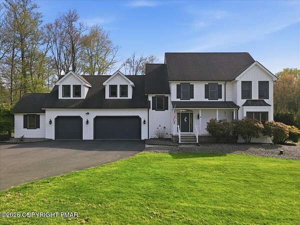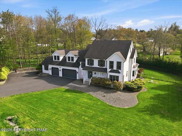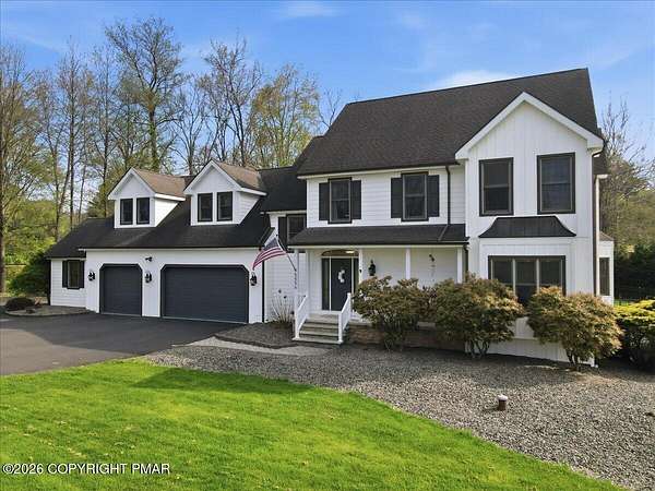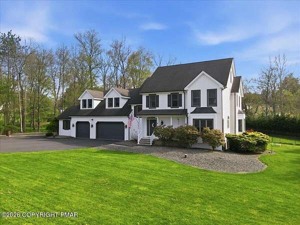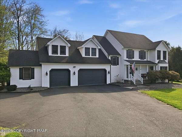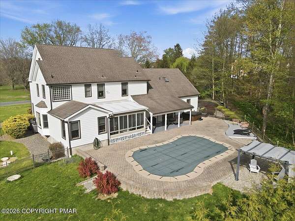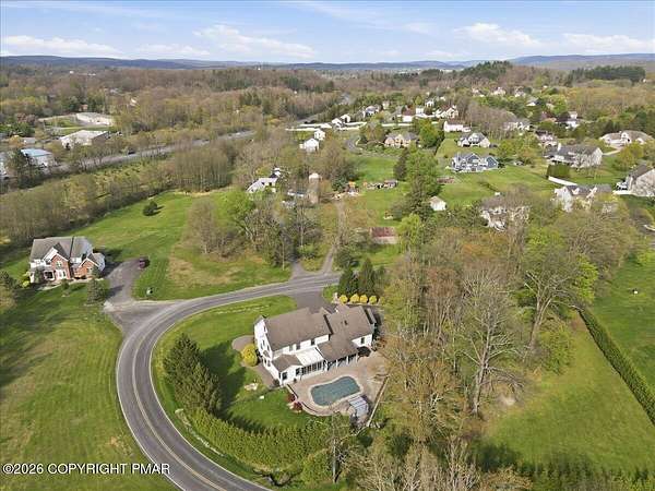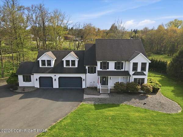 Welcome to a Colonial home that truly delivers on space, style, and lifestyle--offering 5 bedrooms, 4 full, 2 half bathrooms, and over 5,300 sq ft set on 1.54 private acres in the highly sought-after Stroudsburg School District. With no HOA, this property combines privacy and convenience just minutes from everything the Poconos has to offer. At the heart of the home, the chef's kitchen makes an immediate impression, featuring quartz countertops, a striking live-edge island, and a sunlit breakfast nook. It opens effortlessly into the formal dining area and a warm, inviting family room with custom built-ins and a dramatic stone fireplace--designed for both everyday living and memorable gatherings. A private office overlooking the backyard offers the perfect work-from-home setting. Upstairs, the primary suite is a true retreat, complete with a spa-inspired bath and radiant heated floors. A secondary en-suite, spacious bonus room, and additional bedrooms provide flexibility and comfort for a variety of living arrangements. The lower level expands your living space even further, offering the perfect setup for recreation, guests, or a home gym. Step outside and the property truly shines. The backyard is designed for resort-style living, featuring an expansive patio, covered outdoor living area with fireplace, built-in grilling station, and a saltwater in-ground pool surrounded by wrought iron fencing. A screened-in porch adds another layer of comfort, creating the perfect place to relax and unwind. Additional highlights include a dedicated laundry room and an oversized garage with new epoxy flooring and extensive storage. This is more than just a home--it's a private retreat offering space, flexibility, and a lifestyle that's hard to replicate.