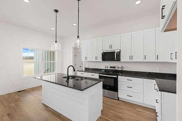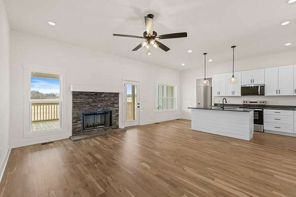 BRAND NEW Modern Farmhouse sitting on over 5 Acres! Enjoy peaceful country living in this stunning new construction home featuring high ceilings, abundant natural light, and an open layout perfect for gathering. Cozy up by the stone gas fireplace or entertain with ease in the kitchen complete with black granite countertops, a large island, and stainless steel appliances. Need more entertaining space, this home also has a large bedroom or bonus room upstairs with full bath!