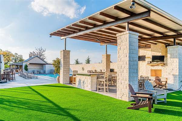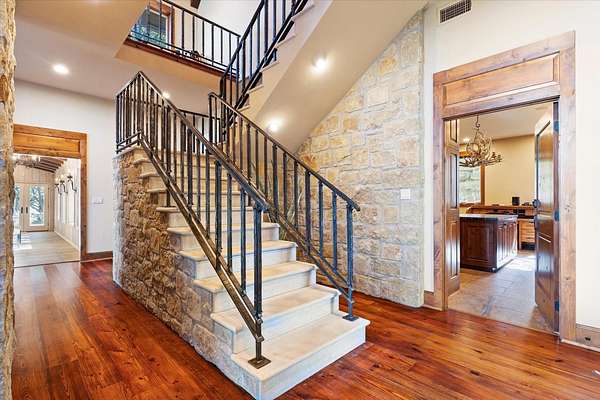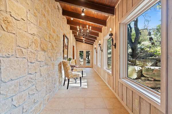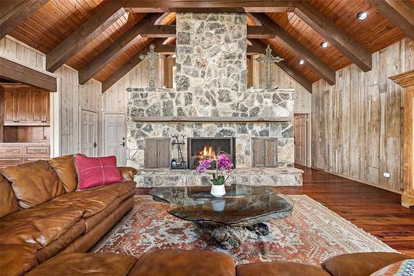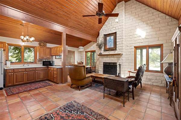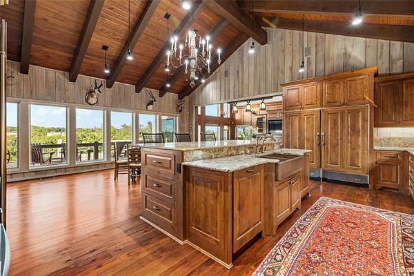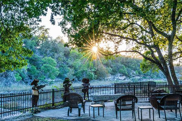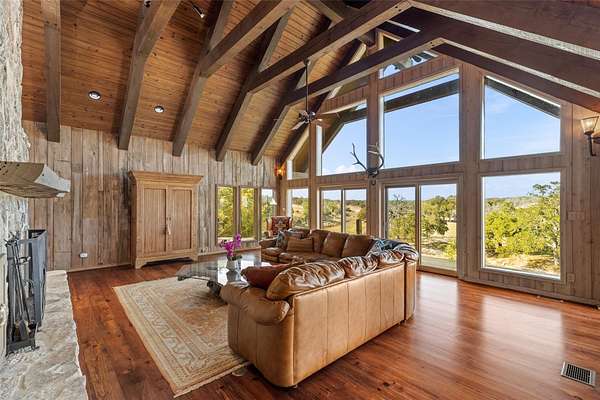 LUX Waterfront Ranch Home PRICED TO SELL!! New Updates & Turn-key! In The Heart of TX Hill Country, within the prestigious Maverick community, lies a luxurious lakeside 8,384sqft ranch home. Perfectly situated between the historic towns of Fredericksburg & Kerrville, this property offers the ideal blend of country solitude with easy access to urban conveniences, vibrant local culture,& renowned wineries. The Lake House: surrounded by 21.14acres of mature live oaks, live water, exotic wildlife, and rolling terrain, this unique 3-story 5bed 6bath Ranch Home with Guest House, sits hilltop with an expansive wrap-around deck overlooking its private lake with mile-long creek views. 2 spring-fed converging live water creeks, Klein & Stevens, intersect home-front where a large concrete dam gives this property a beautiful year-around lake. Maverick community enriches living with high-end amenities including: High-fenced perimeter & grand gated entrance, diverse exotic wildlife, On-site groundskeeping, high-speed fiber, underground utilities. 7miles paved roads, Resort-style clubhouse, pool, pavilion area, & entertainment area. Sports enthusiasts will appreciate the BB & pickleball courts, while the Naturalist enjoys expansive green spaces & hiking trails leading the scenic Overlook. The kids are sure to be found at the famous live water Blue Hole or creek bottom exploring. Home itself marries architectural elegance with functional luxury. Cathedral ceilings, grand stone fireplaces, floor-to-ceiling windows, gourmet kitchen equipped with top-tier appliances, and the dual master suites provide sumptuous privacy. Property also features a guest house, an equestrian barn, workshop, and garage. This estate is not just a home but a lifestyle, offering an unparalleled blend of rural tranquility & luxury amenities. Updates: New Exterior Paint, Decking, & too many restorations to list. Exotics Include Wildebeest, Oryx, and more. SEE HIGHLIGHT VIDEO. Furniture=Convey
