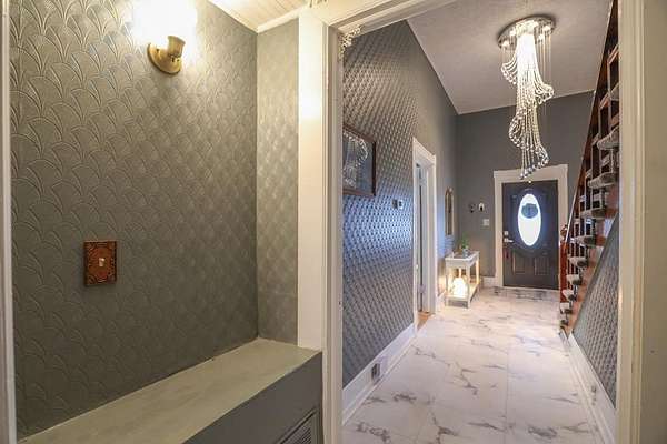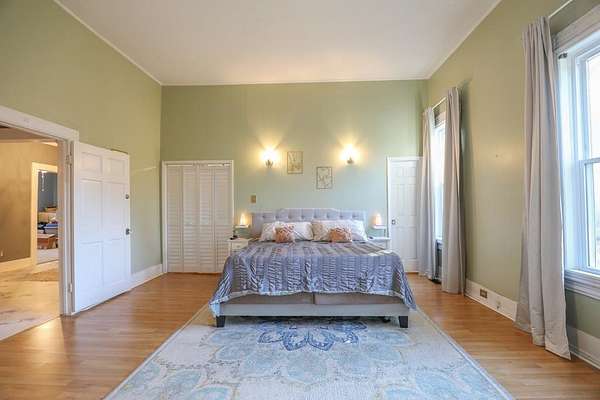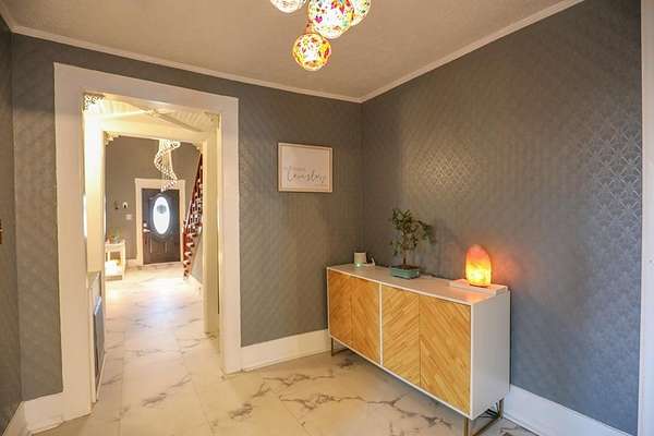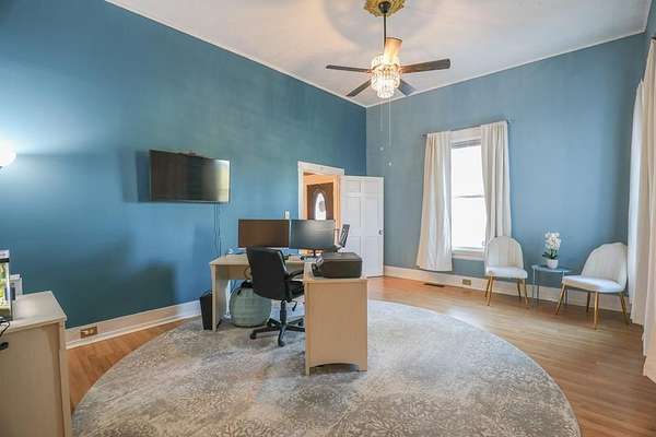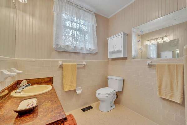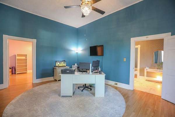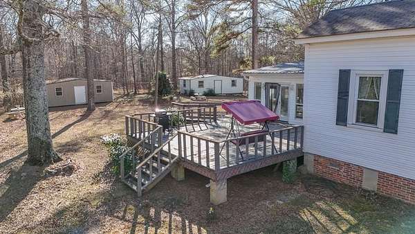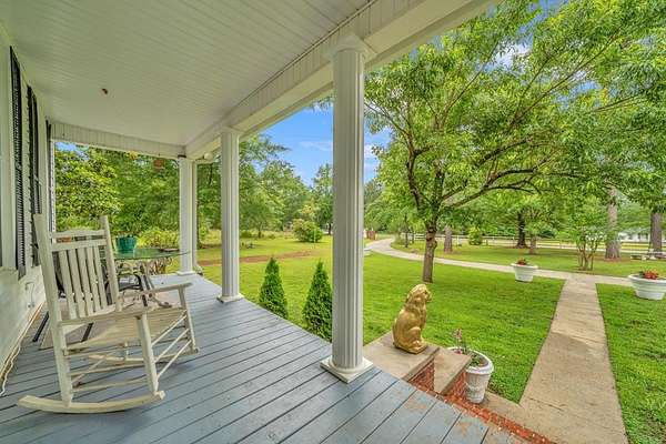 Set behind a gated entrance, this reimagined 1920s Colonial offers rare estate-like privacy in a peaceful, rural setting near Milledgeville. Originally rooted in the historic downtown area and relocated in the early 1980s, the home retains its classical architecture while benefiting from extensive modern updates. Historic charm shines through original moldings, soaring ceilings, and three fireplaces, paired with a renovated kitchen, updated bathrooms, new flooring, most windows replaced, new light fixtures, and two HVAC systems with updated ductwork. The spacious layout includes five bedrooms, large closets, a main-level primary suite, office space, separate family room, sunroom, pantry, and laundry room. Outdoor features include a classic Southern front porch, fenced backyard, large garage with workshop, and two oversized sheds with electricity and gas. Mature landscaping and surrounding open space provide a level of privacy rarely found in historic homes. Ideal for those who appreciate classical architecture, seclusion, and versatility in a one-of-a-kind setting.