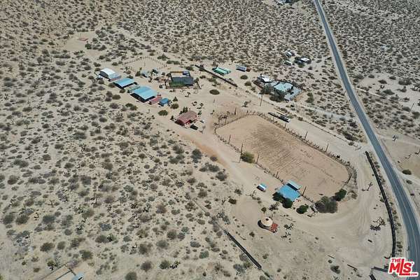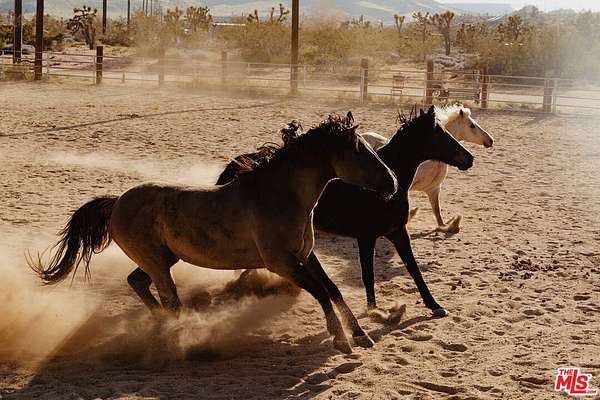 True equestrian estate in Pipes Canyon spanning nearly 10 acres across two legal parcels with sweeping views of towering lava buttes and expansive High Desert skies. The ranch is anchored by a rare one-acre lighted horse arena with viewing booth designed for training, clinics, and events. Infrastructure includes a 4-stall mare manor, large turnout with additional stalls, tack and hay storage, three 40-foot shipping containers, and four 80-foot covered bays providing significant shade and operational flexibility. The property is fully fenced and serviced by a private well. Two separate ranch-style residences each offer 3 bedrooms and 2 baths, totaling approximately 3,009 square feet combined. Both homes feature vaulted ceilings, wood-burning fireplaces, central heat and air, spa-style soaking tubs, and fenced yard areas ideal for privacy. Outdoor amenities include a shaded wraparound porch, hot tub, fire pit, BBQ area, and RV hookups, creating a turnkey desert retreat.Currently operating as a successful Airbnb property, the estate offers consistent income potential while preserving its identity as a fully functional working ranch. Located between Yucca Valley and Pioneertown with convenient access to Joshua Tree National Park, dining, and shops, this is a rare opportunity to own a built-out equestrian compound with lifestyle and revenue in one of the High Desert's most dramatic settings.