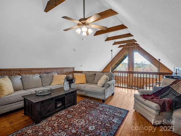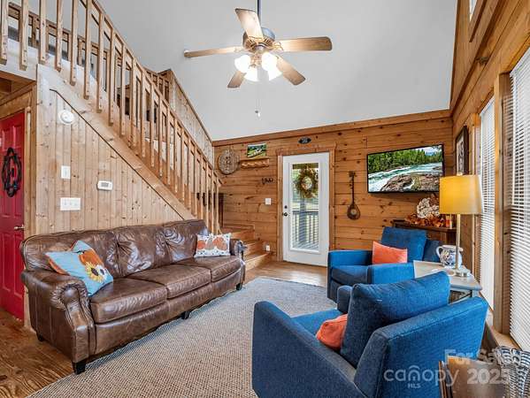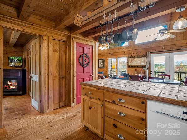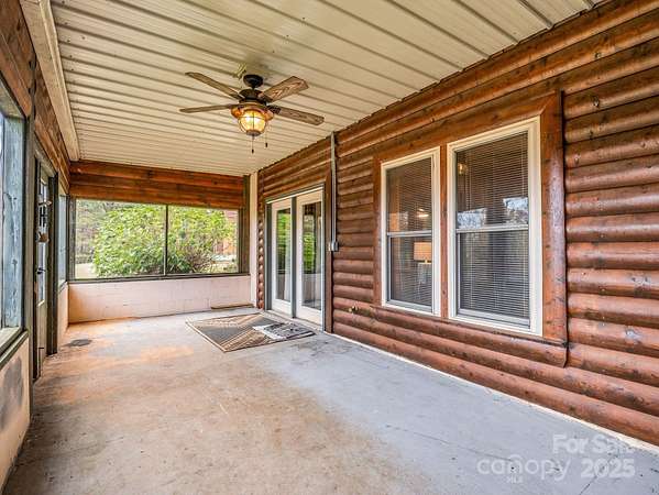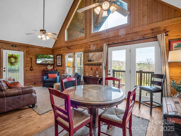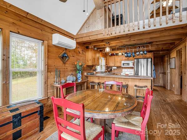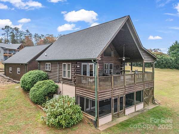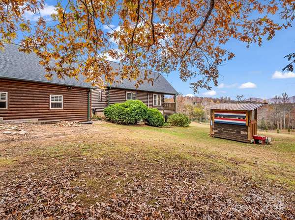 Cozy log cabin with a 2-car detached garage at the tip of a quiet cul-de-sac, overlooking gorgeous year-round, long range mountain views and the adjoining Emerald Lake. Front-to-side wrap-around covered porch perched above this 3.07-acre parcel offers a peaceful setting & sunsets. The main level boasts an open concept cathedral ceiling living room, kitchen with a nice breakfast bar, dining area, laundry closet, full bathroom, and primary bedroom. The bedroom or sleeping area for guests. Downstairs in the walk-out finished basement you'll find a large en-suite bedroom with an office/flex space, full bath, laundry closet, and a screened, covered porch with access to the backyard. There is also an unfinished fully insulated storage space that could be converted to finished, and another exterior entrance to a tool storage area. The main level two car garage has a finished unheated area above the garage with two closets that could be turned into another en-suite bedroom by adding plumbing in one of the closets for a bath and utilizing one of the unused mini splits from the main house. Concrete drive with ample parking and a RV parking area with water, electric and sewer hookups. Brand new HVAC system installed Nov. 1st, 2025.