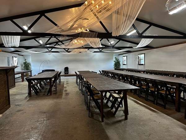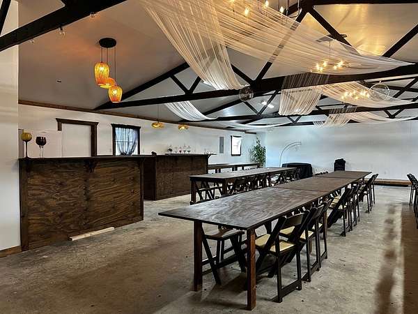 Versatile Event or Business Space! Discover endless possibilities with this 2,800 sq ft metal building situated on a spacious 3.77 acre lot. Currently outfitted as an event venue, the interior features a large open-concept gathering space adorned with exposed beams and ambient pendant lighting - ideal for hosting receptions, meetings, or community functions. The building includes two interior rooms that could serve as office spaces, dressing rooms, or storage. There are two restrooms, each equipped with toilets and vanities, making it convenient for guest use. Please note: the building does not currently have HVAC installed- offering buyers the flexibility to install a system that fits their specific needs. The concrete floors, wooden bar area, and functional layout offer a blank canvas ready for your vision - whether it's a venue, business headquarters, creative studio, or workshop. The exterior boasts a clean, modern farmhouse look with a metal roof, and a peaceful setting just outside of town. With plenty of space for parking, expansion, or outdoor use, this property offers flexibility and room to grow. Don't miss the opportunity to own this adaptable space in a serene, semi-rural setting. Click virtual tour for brochure.