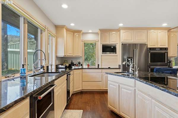 - Appliance Garage, Builtin Oven, Builtin Range, Builtin Refrigerator, Cook Island, Dishwasher, Disposal, Double Oven, Free Standing Range, Free Standing Refrigerator, Granite, Instant Hot Water, Island, Microwave, Stainless Steel Appliance, Trash Compactor