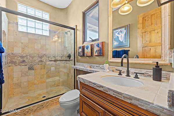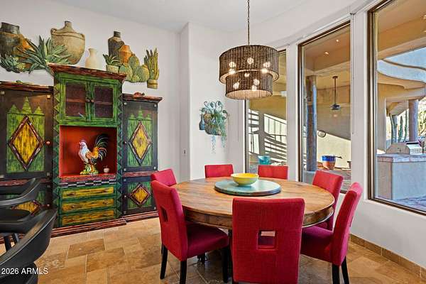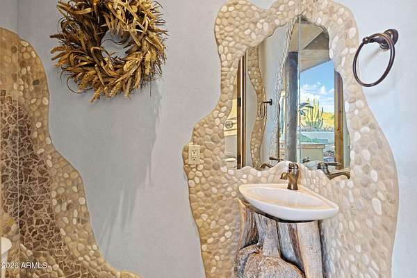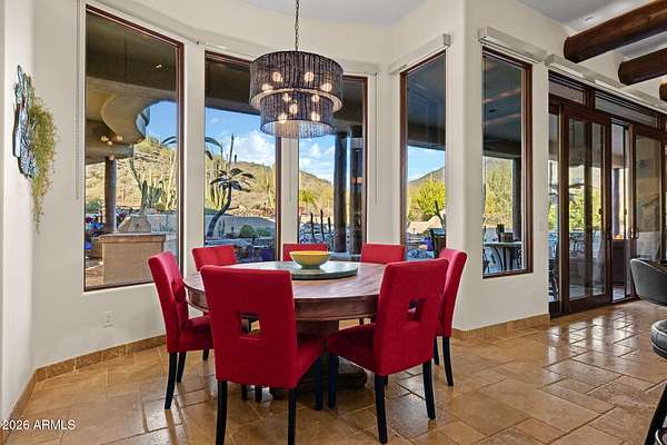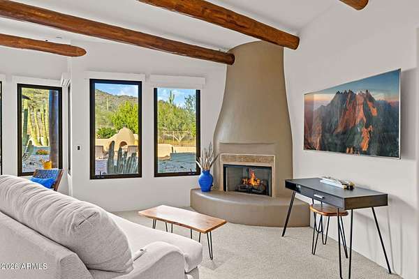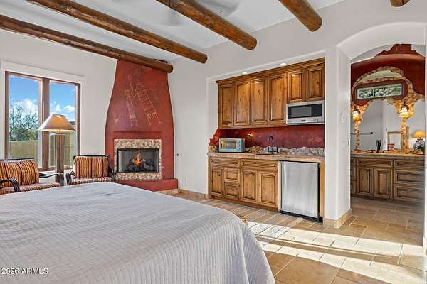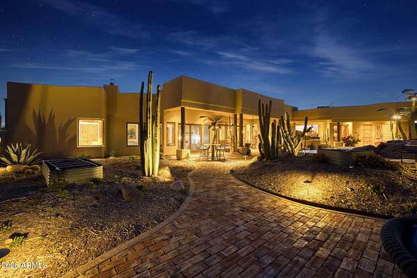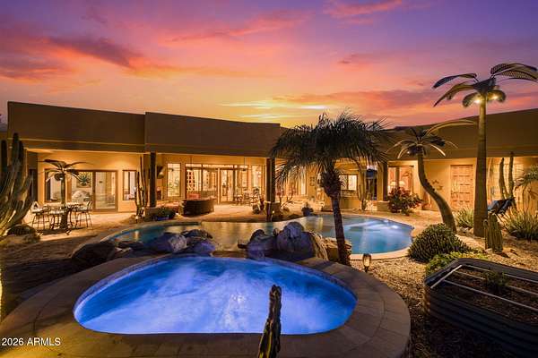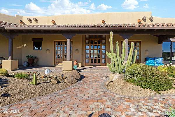 Truly one-of-a-kind! This extraordinary Spanish Estate delivers exceptional Privacy and Peaceful Desert Elegance, perfectly nestled against the Mountain Preserve on a Premium 1.92-Acre cul-de-sac lot in prestigious Canyon Ridge Estates! Wake up to breathtaking Black Mountain views and end each day with unforgettable Arizona sunsets. This timeless Estate blends authentic Craftsmanship with refined, Functional Luxury, a Rare Turnkey Opportunity in the heart of Cave Creek! The 4,184 sq ft Main Residence and 517 sq ft Detached Casita showcase classic Old World architecture paired with modern comfort. A pavered circular drive leads to a private courtyard surrounded by mature desert landscaping and a warm, inviting outdoor fireplace. Inside, exposed wood beam vigas, custom alder cabinetry, Rain Forest Granite, and handcrafted tile details create rich character and warmth. The Chef's kitchen is designed to impress with Wolf, Sub-Zero, and Fisher & Paykel appliances, oversized island, cafe dining, and breakfast bar - ideal for entertaining! The Owner's Retreat is pure serenity, featuring a fireplace, sitting area, and stunning custom barrel ceiling. Three additional ensuite guest rooms offer comfort and privacy, while the detached casita provides flexible luxury living with fireplace, kitchenette, living area, walk-in closet, and custom bath. Step outside to your private resort sanctuary backing to saguaro-dotted mountains, fruit trees, beautiful landscapes. Enjoy a heated negative-edge saltwater pool and spa, multiple lounge areas, dual fireplaces, built-in BBQ, pool bath, and spiral staircase leading to a rooftop deck capturing glowing crimson sunsets and sparkling city lights! This is not just a home -- it is an elevated desert lifestyle.