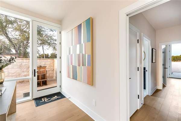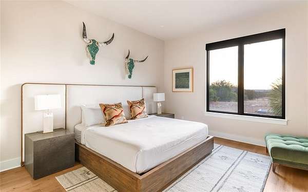 The 2,907-square-foot main home is thoughtfully designed with a clean, modern Hill Country aesthetic, blending natural materials, strong lines, and expansive windows that bring the surrounding landscape indoors. The home was built with wellness in mind and includes a private sauna, cold plunging tub, and mineral soaking tub, creating a true retreat-style environment for everyday living.