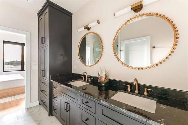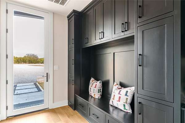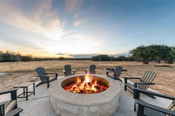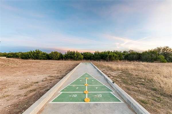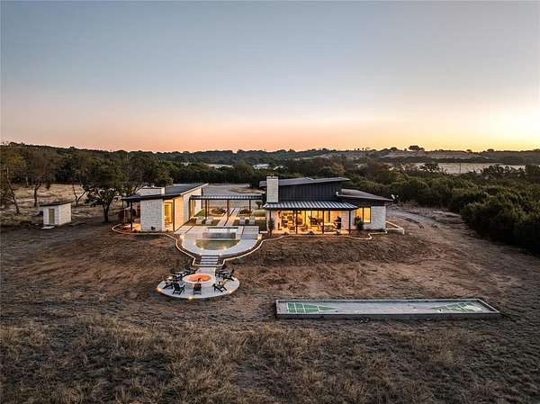 Outdoor spaces are designed for both relaxation and enjoyment, featuring a fire pit and an oversized outdoor concrete shuffleboard court perfect for entertaining friends and family while taking in the wide-open views and Texas skies.