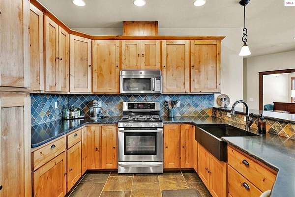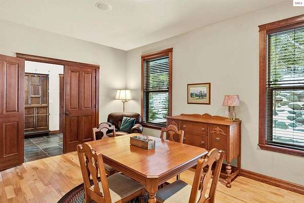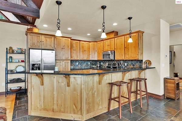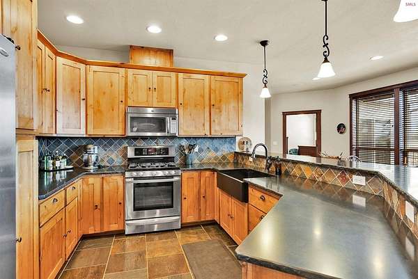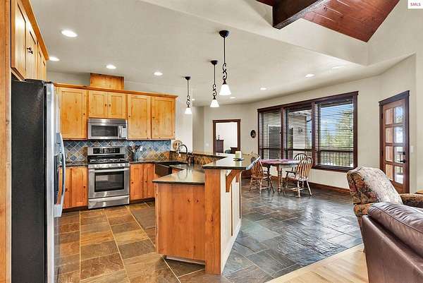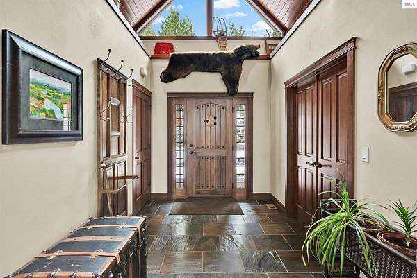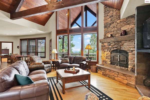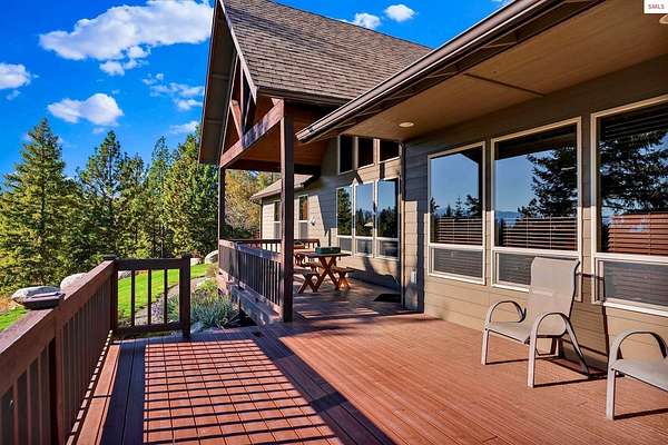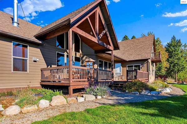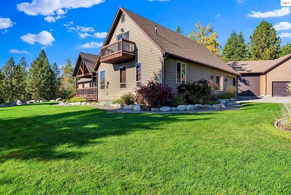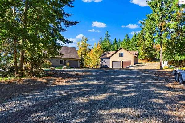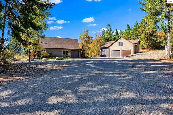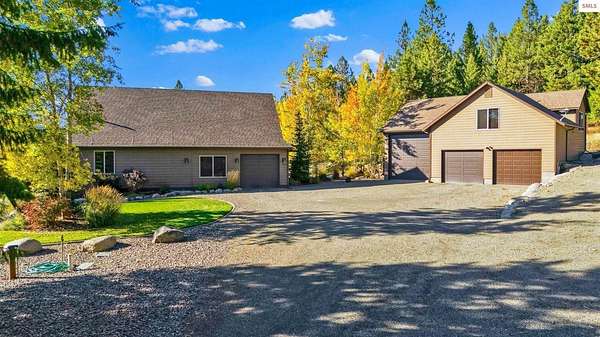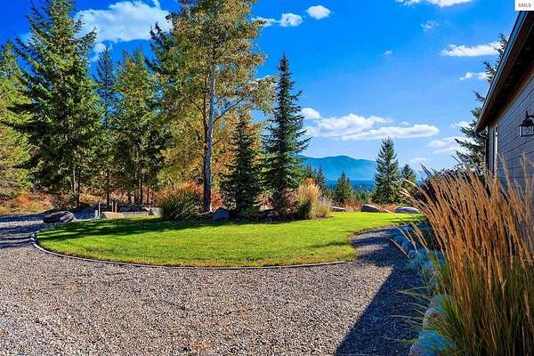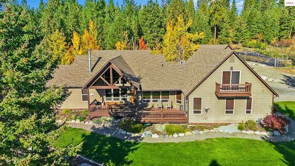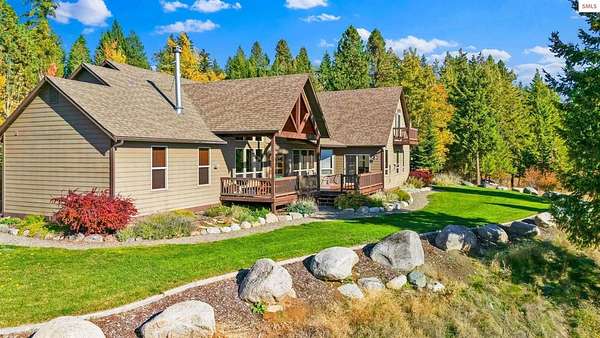 This extraordinary North Idaho estate offers 3,400 sq ft of refined living with 4 bedrooms, 2 bathrooms, a detached heated high-bay shop, and a 750 sq ft guest house (ADU) on 5.43 private acres with expansive, elevated views of Roman Nose, Black Mountain, and Schweitzer. Located approximately 45 minutes from Sandpoint, it delivers privacy, space, and convenience in one rare offering. Vaulted ceilings and expansive windows frame the mountain landscape, filling the living room and chef-inspired kitchen with natural light. Maple hardwood floors, granite surfaces, and a wood-burning fireplace create a space that feels both grand and welcoming. A formal dining room adds elegance, while the primary suite offers deck access and a spa-like bath with jetted tub. Flexible bonus spaces provide room to adapt. Outside, established orchards and a highly productive garden reflect years of thoughtful cultivation. The sloped acreage enhances privacy and panoramic perspective while offering opportunities for additional outbuildings or customized land use. Portions of the acreage may accommodate a horse or small livestock with planning and improvement. The detached shop accommodates RV storage and workspace. A rare blend of craftsmanship, flexibility, expansive views, and North Idaho living.