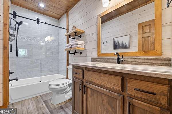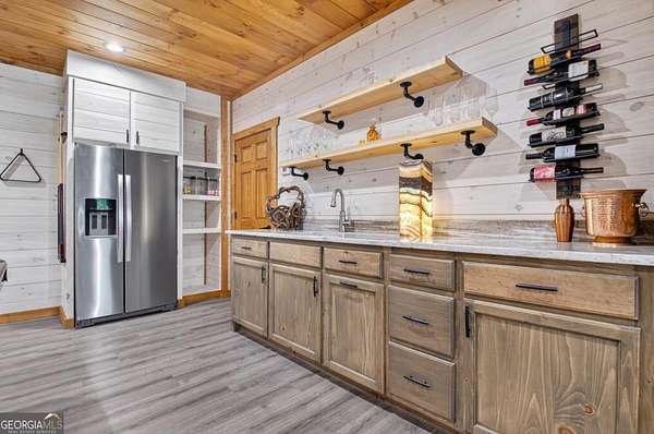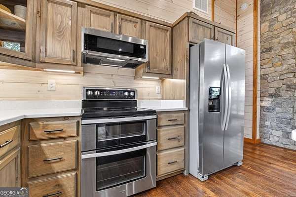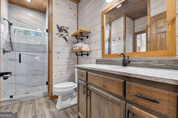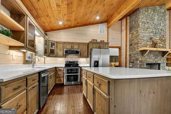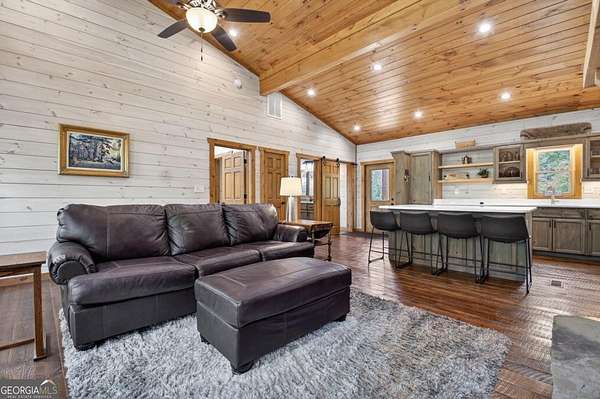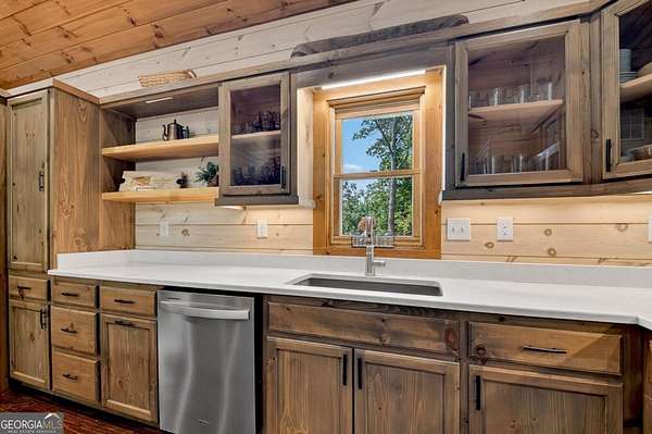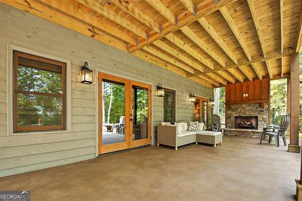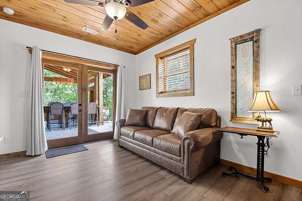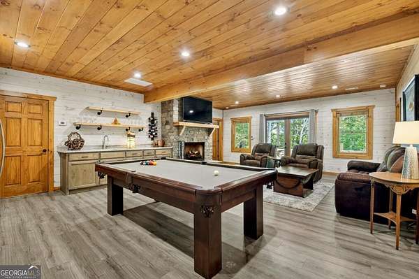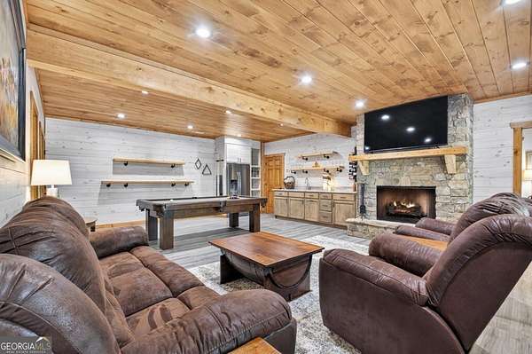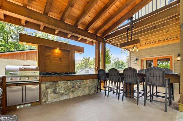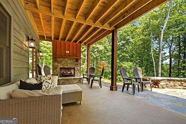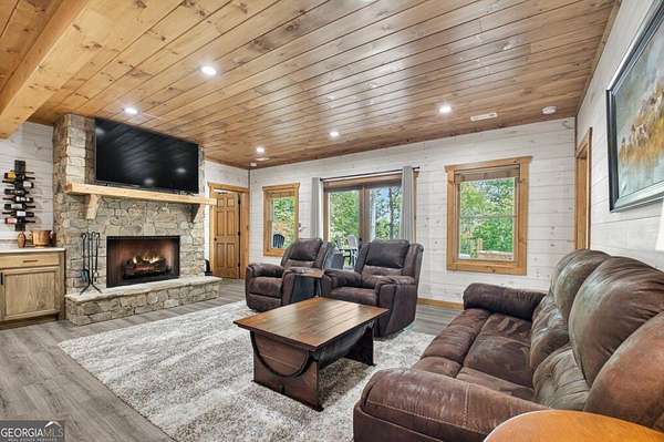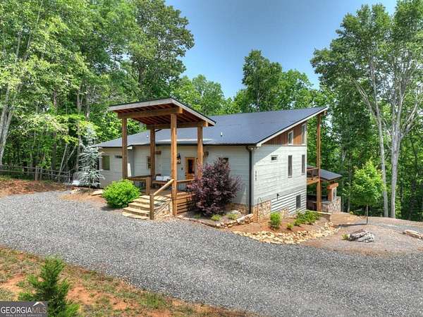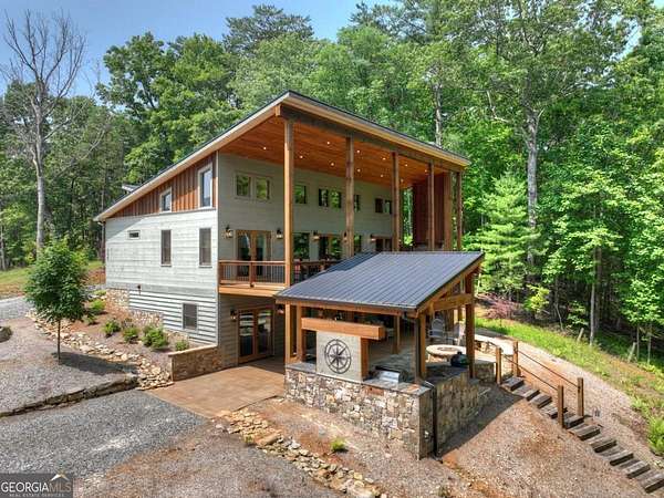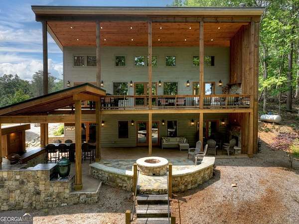This beautifully designed 4 bedroom, 4 bathroom modern-style home offers luxury living with thoughtful details throughout. The main floor features vaulted ceilings, an open layout, custom cabinetry with granite countertops, and a cozy gas fireplace. Two bedrooms on the main level include private ensuite baths and direct access to the expansive back porch. The terrace level includes two additional bedrooms, each with ensuite baths, a wet bar, and ample storage space. Outside, enjoy professionally landscaped grounds and year-round mountain views that transform beautifully with the seasons. A newly added oversized two-car garage includes a deck and RV hookup for added functionality. The standout outdoor kitchen is fully equipped with granite countertops, a Big Green Egg, cooktop, grill, bar seating, and a grand wood-burning fire pit at the center of it all! This home seamlessly blends modern comfort with mountain charm, offering an exceptional opportunity for full-time living or a high-end retreat! Perfectly situated in a prime location, this property is just minutes from some of the area's best outdoor recreation-enjoy easy access to hiking trails, the Toccoa River, and Lake Blue Ridge!