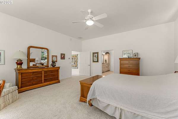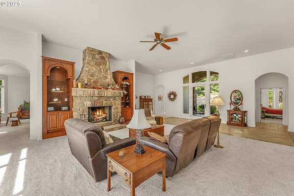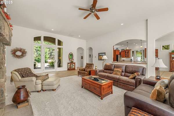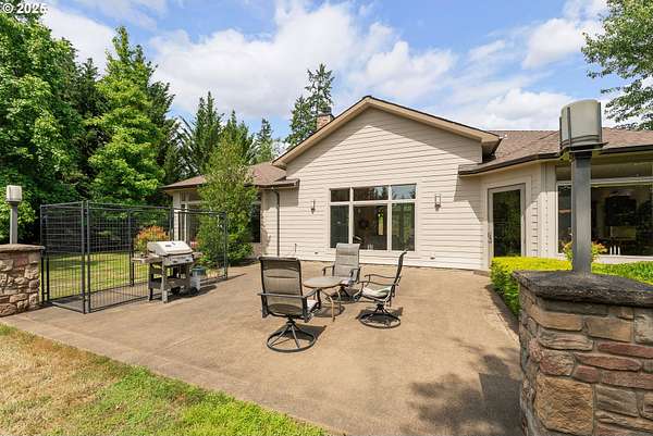 Tucked away at the end of a quiet private lane, this beautifully designed single-level custom home offers serene living with thoughtful luxury throughout. Soaring high ceilings and expansive large Marvin windows fill the interior with natural light, creating an airy, inviting atmosphere that connects seamlessly to the surrounding landscape.Thoughtfully laid out with two spacious primary suites, one with a walk-in closet, and a luxurious ensuite bath featuring a soaking tub, tile shower, and dual vanities-ideal for multigenerational living or hosting in comfort. With two separate living spaces, there's plenty of room to relax or entertain.The heart of the home is the large chef's kitchen, complete with a generous island, sleek stainless-steel appliances, and ample cabinetry-perfect for gatherings or quiet evenings in. A striking stone fireplace anchors the main living area, offering warmth and ambiance year-round.Additional highlights include there is only one step in the house going from the home to tile patio, walk or roll-in showers and an oversized, extra-deep garage with abundant storage space, and high-end finishes throughout. Call for your private tour today!