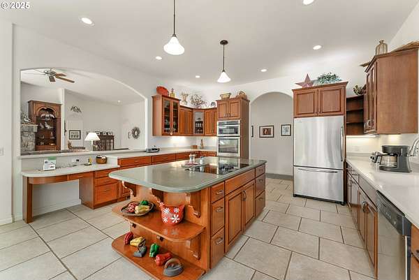 - Builtin Oven, Cooktop, Dishwasher, Disposal, Instant Hot Water, Island, Microwave, Pantry, Stainless Steel Appliance, Tile