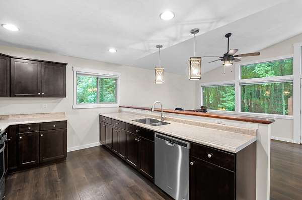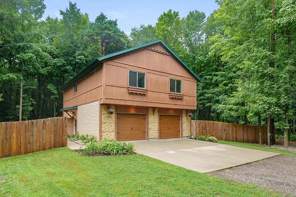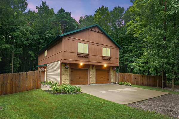 This sharp 2016-built home is the perfect mix of modern features & rustic charm! Nestled on 2+ acres of land, you've found the ideal blend of wooded areas & open spaces. Great Room w/cathedral ceiling, gas log FP & windows spanning from floor to ceiling. Overlook the spacious deck, large privacy-fenced yard & gorgeous wooded views. Modern laminate flooring flows through the kitchen & open dining area. Rich stained cabinetry, stainless steel appliances, plus expansive snack bar. Open design, perfect for entertaining or cozy gatherings. 2 upper level bedrooms, plus full bath. Versatile main level, currently used as primary bedroom w/en suite. Sliding glass door to covered patio & hot tub area. Main floor laundry includes washer/dryer, plus storage. Water softener included. Oversized 2-stall garage, plus shed. Stunning curb appeal w/stacked stone accents. Beautiful private setting! Current owners used Xfinity for internet, S&F for propane(rented tank).